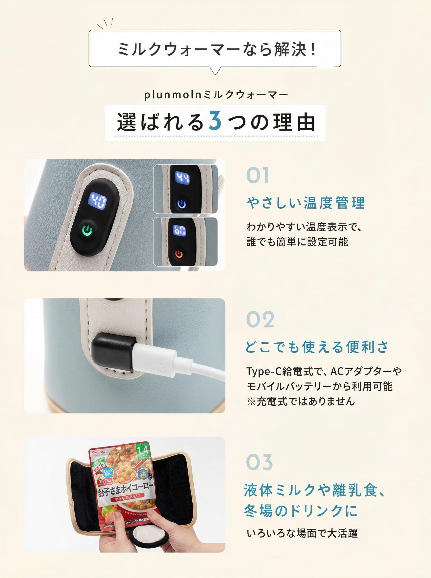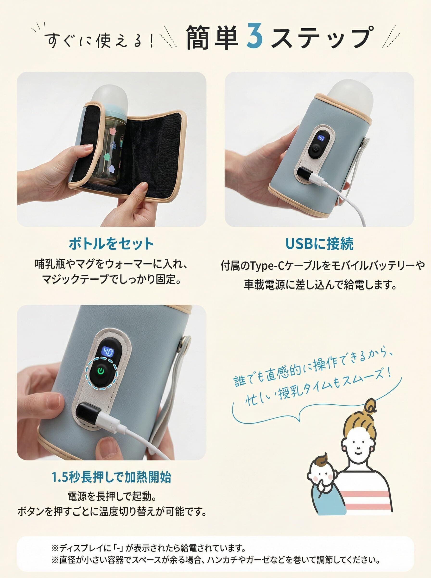 外出先や夜間授乳時でもミルクの温度を一定に保てるミルクウォーマーで、LCD表示により現在温度を確認しながら調整できます。ブルーは40〜60℃を1℃単位で設定可能、グリーン・ピンクは38〜55℃の5段階切替に対応。USB Type-C給電式でモバイルバッテリーや車載電源、PCから使用でき、充電式ではないため長時間の外出にも便利です。本体は約120gの軽量設計で、バッグに収まりやすいコンパクトサイズ。防水PUレザー素材を採用し、汚れても拭くだけでお手入れできます。哺乳瓶のほか、液体ミルク、マグ、ペットボトル、缶飲料にも対応し、離乳食や冬場のドリンク保温、非常時の備えとしても活用可能です。サイズは横31×縦14cm、直径約7cmまで対応し、本製品は「保温」を目的としているため、冷たい飲料を短時間で加熱する用途には適していません。