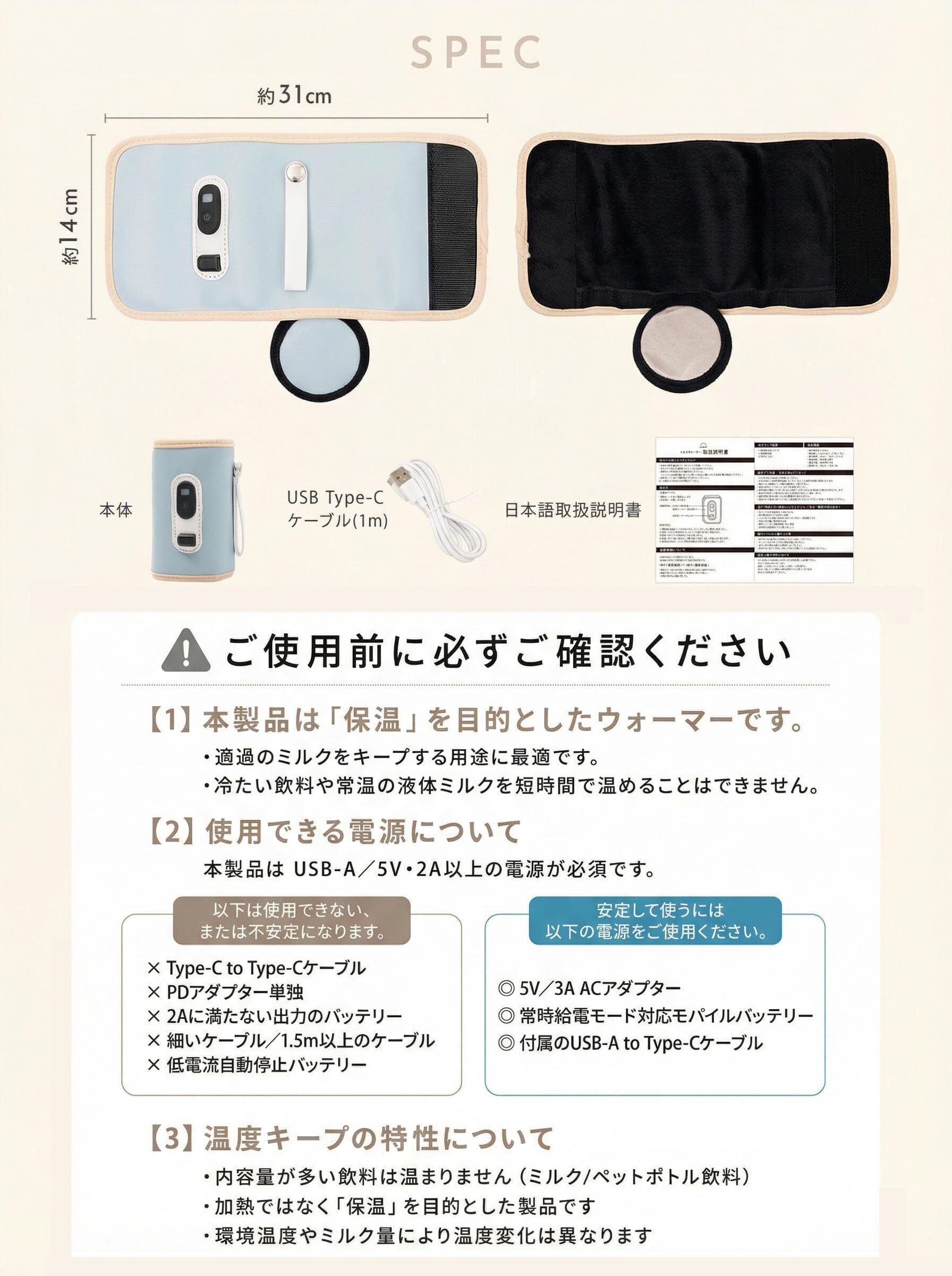 【仕様】 サイズは横31×縦14cm、対応容器は直径約7cmまで。内部には加熱フィルムを内蔵し、内容物を包み込むように保温します。本製品は「保温」を目的としたウォーマーで、冷たい飲料を短時間で加熱する用途には適していません。