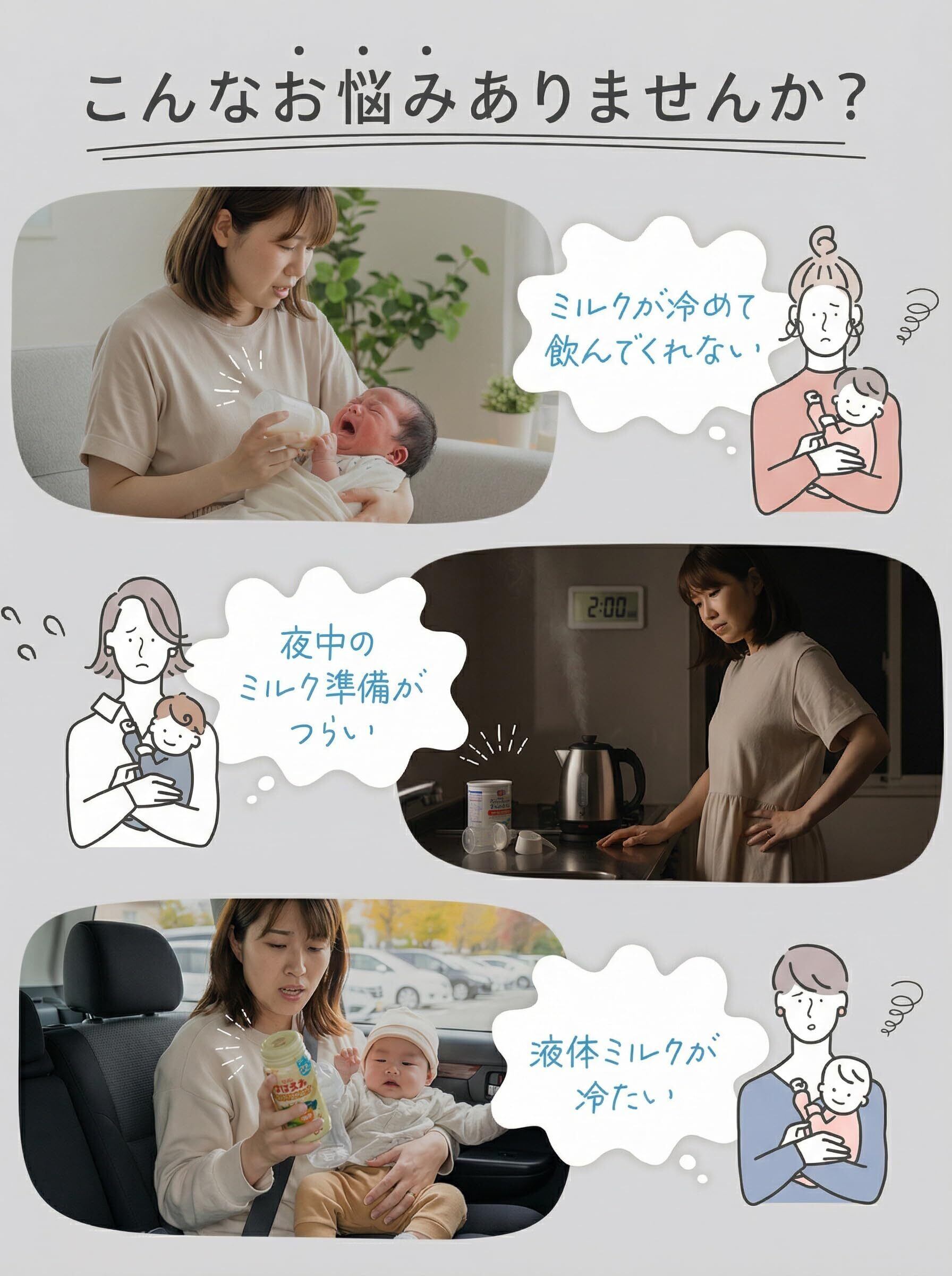 【対応シーン】 哺乳瓶だけでなく、液体ミルク、マグ、ペットボトル、缶飲料にも対応。育児中はもちろん、離乳食の保温や冬場のドリンク保温など幅広い用途で活躍します。非常時の備えとしても使いやすい設計です。