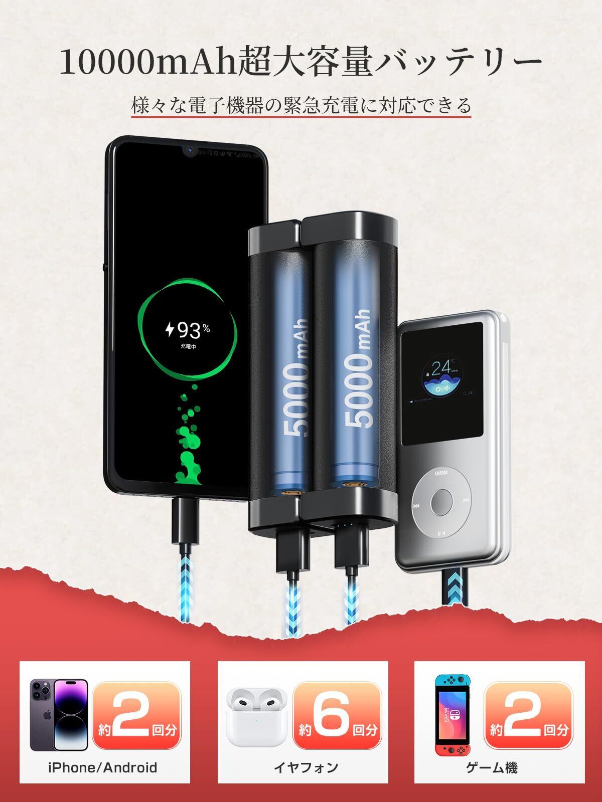 【1台2役・大容量10000mAh】カイロにもモバイルバッテリーにもなる、冬の最強マルチアイテム!️ 10000mAh(5000mAh×2)の大容量バッテリー搭載、ハンドウォーマーとしてだけでなく、スマホ・タブットなどの充電も可能。1つを温めながら、もう1つで充電。外出がぐっと楽になる!【最大連続14時間の暖かさ】温度モードに応じて、しっかり長時間発熱:低温モード:約7~14時間、中温モード:約5~7時間、高温モード:約4~6時間(※使用時間は2つのカイロの合計で、周囲温度や使用状況により変動することがあります。)この冬は、暖かさと充電の心配を、ひとつに。