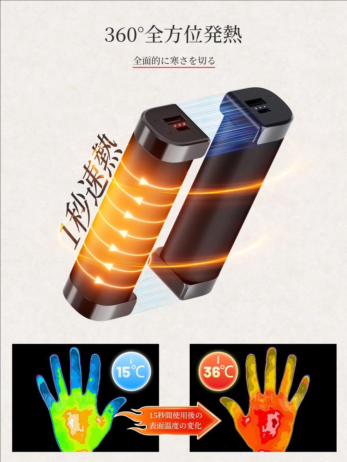 【1秒でポカポカ!360°全面発熱】充電するだけで、繰り返し使えるエコなカイロが新登場!寒さが厳しい日でも、スイッチを入れてたった1秒ですぐ温もりを実感。手先の冷えが気になる時も、サッと取り出して即効暖まろう。 360°全面発熱設計で、どこを持ってもまんべんなく温かく。握り方や置き場所を選ばず、じんわり持続的なあたたかさが続きます。 繰り返し充電可能なので、使い捨てカイロよりも経済的&地球に優しい。高い保温性能で、アウトドアや通勤・通学、オフィスでも大活躍!