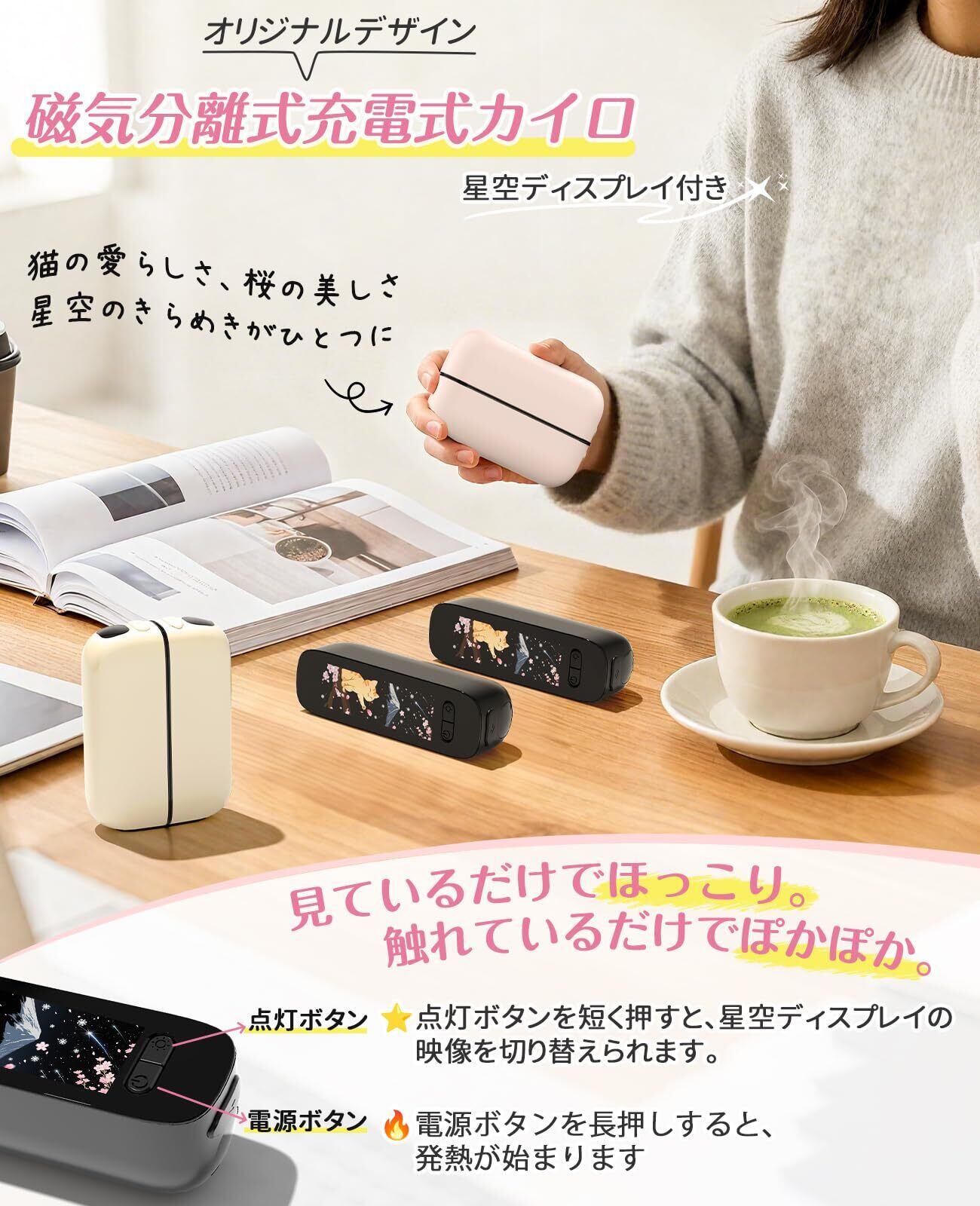 【星空ディスプレイ付き充電式カイロ・お洒落とともに実用!】おしゃれなデザイン・高い実用性・優れたコスト性能。これらがSUKITENの一貫した理念です。2in1マグネット分離式のこの充電式カイロは、美しい和風デザインが光るLED星空ディスプレイが最大の魅力。舞い散る桜や雄大な富士山、夜空を駆ける流れ星、雪で遊ぶ子猫たちなど――季節の風情を感じさせる繊細なパターンが、優しい光でゆらめき、あなたの冬の装いを上品に彩ります。ただ温めるだけでなく、眺めるたびに心まで癒される存在をつくりたい――その想いから生まれたのが、このSUKITEN 星空ディスプレイ付き携帯カイロで、日本の冬の、新しいたのしみ方。