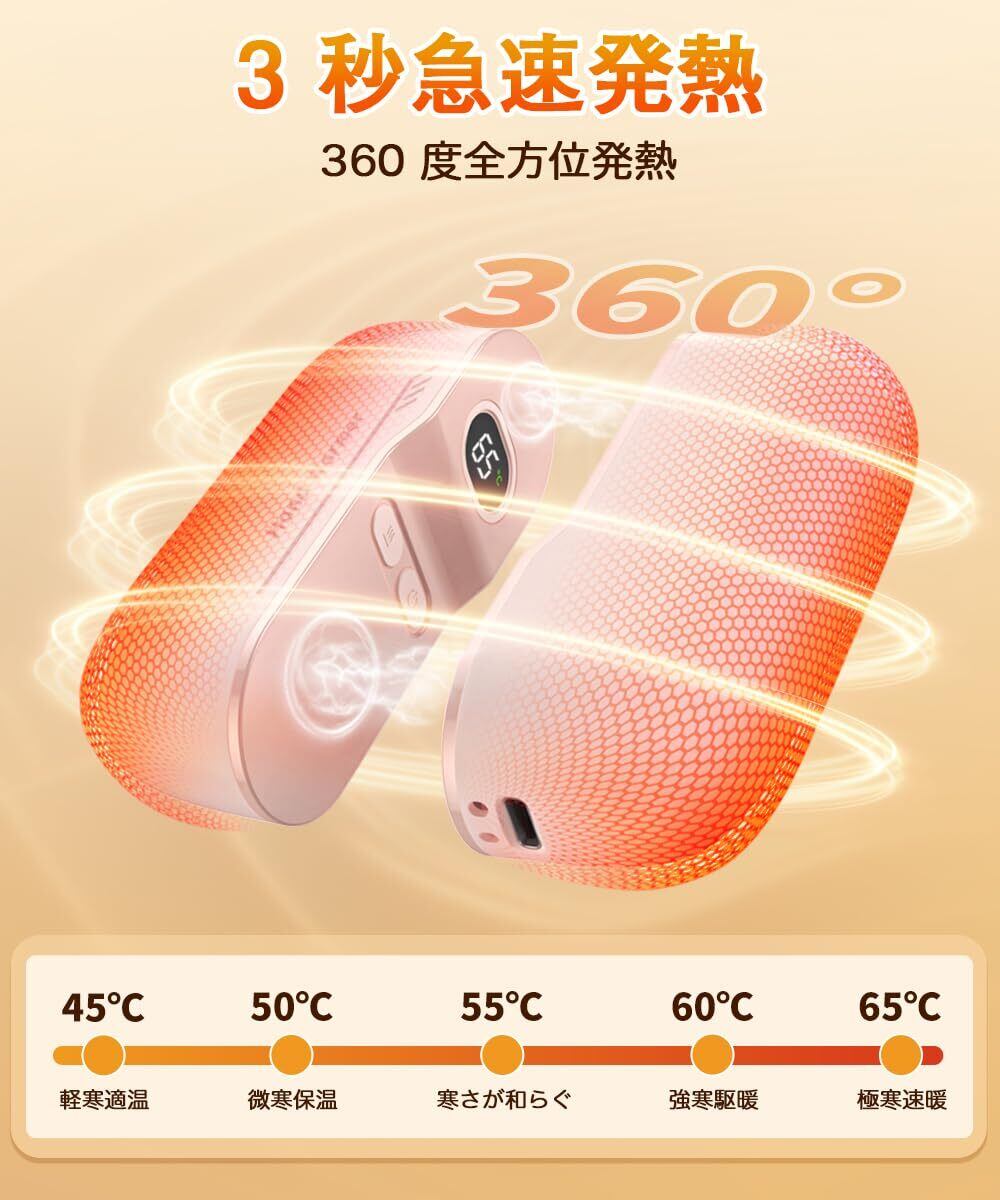 5段階温度調節&高速加熱: 電子カイロは45°C~65°Cまで5種類の温度設定が可能。石墨烯発熱膜による1秒速熱で、充電式ハンドウォーマーは寒い日でもすぐに手を温めてくれます。