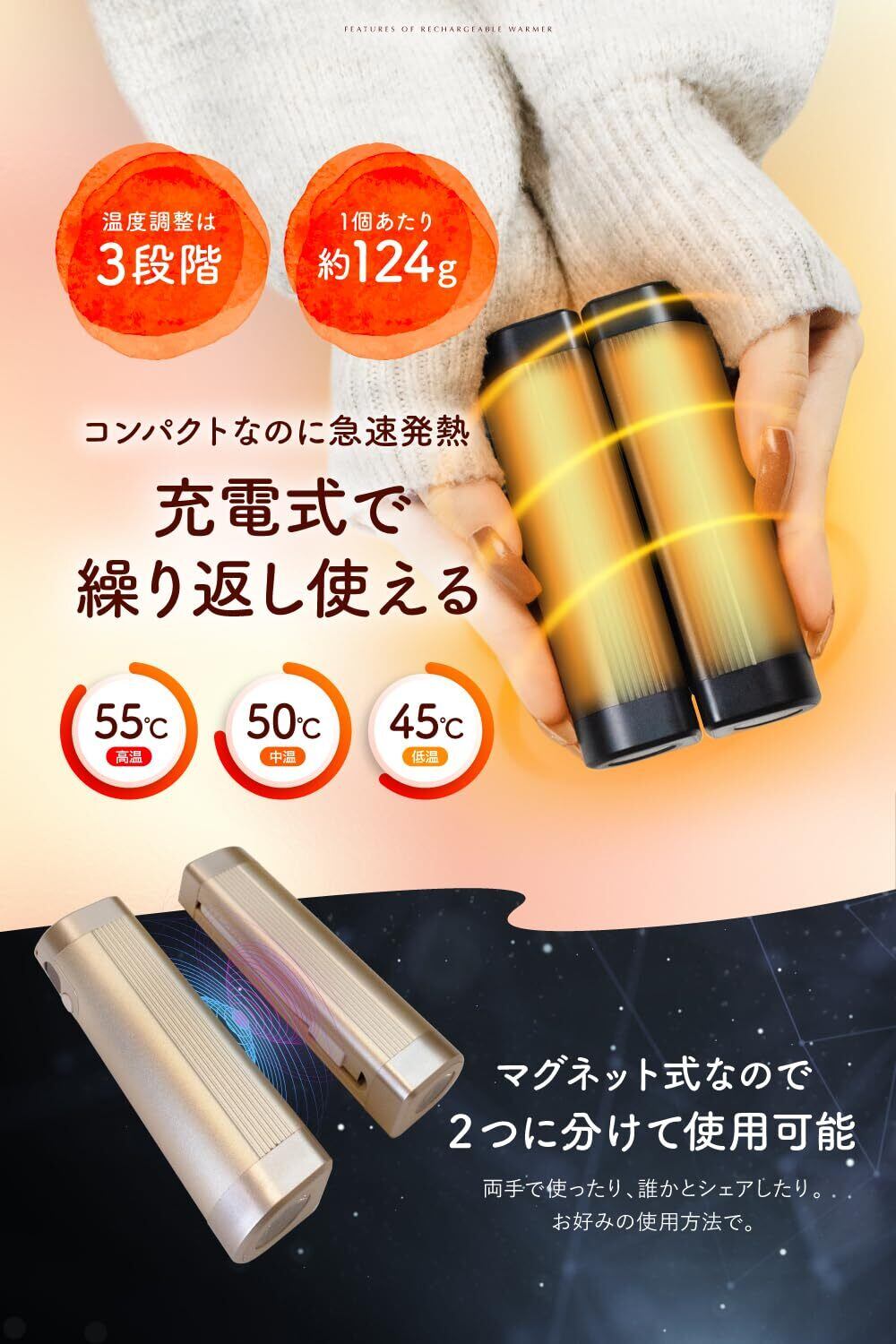 【モバイルバッテリー機能付き】10000mAh(5000mAh×2)の大容量バッテリーを搭載。カイロとしてもモバイルバッテリーとしても使用でき、Type-Cの線も内蔵されているため、持ち運ぶ際に荷物を少なくしたい方におすすめです。※機器を充電しながらカイロとして使用することはできません。【重量】約124g(※1本あたり)