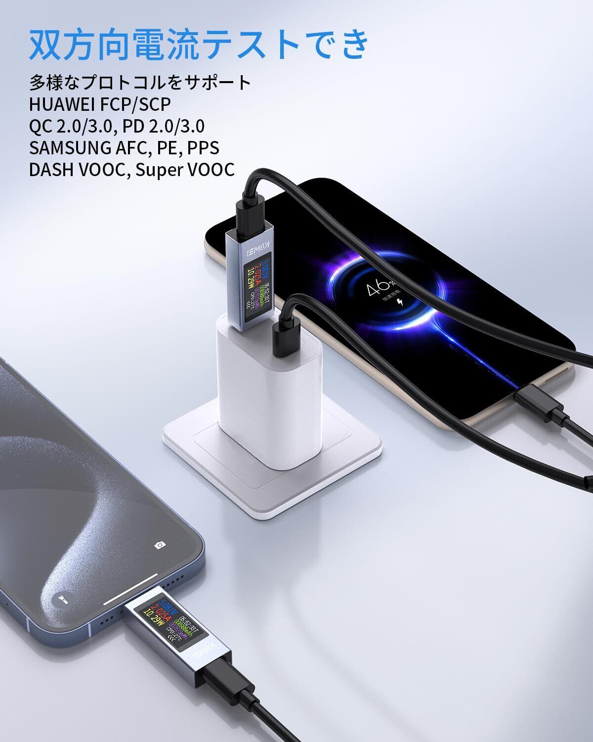 急速充電対応でき:このUSB Cテスターは、PD2.0、PD3.0、PPS、QC2.0、QC3.0、FCP、SCP、AFC、PE、DASH、VOOC、SuperVOOCなどの急速充電テストをサポートします。