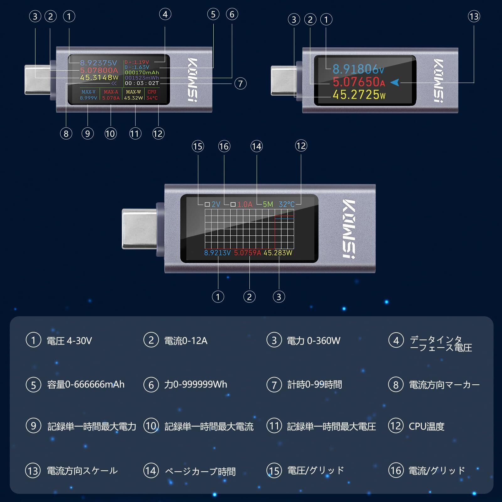 Aideepen 360W 電圧電流チェッカー USB Cテスター メーター usb 電圧 チェッカー Type-C マルチメーターテスター TFTカラーディスプレイ 電流 抵抗 温度 通電時間 容量