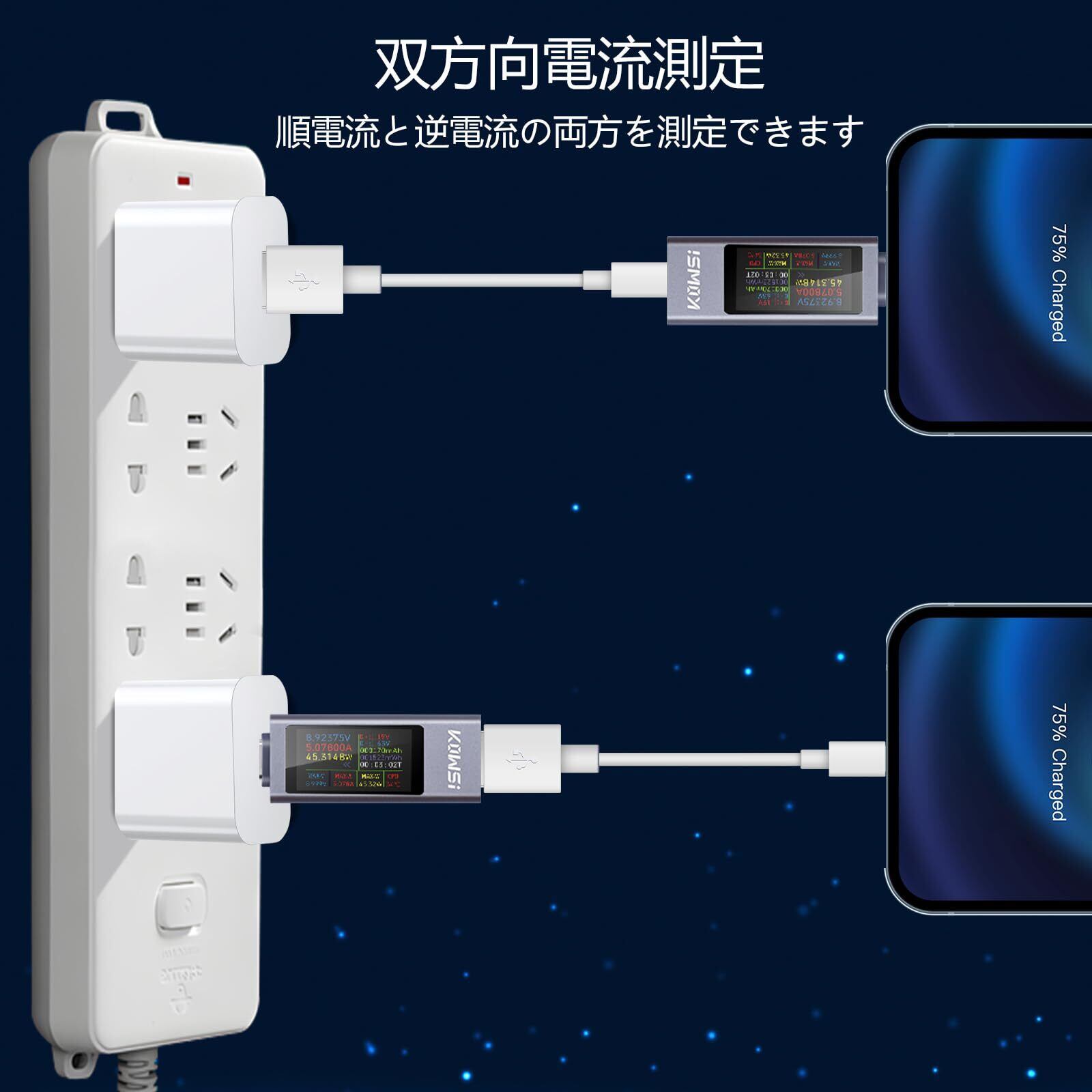 USB C テスター 3 パラメーター:USB ケーブルテスターは、瞬時電圧、電流、電力、温度を表示するだけでなく、連続動作時間、消費電力、充電プロセス全体の最大電圧、最大電流、最大電力を計算します