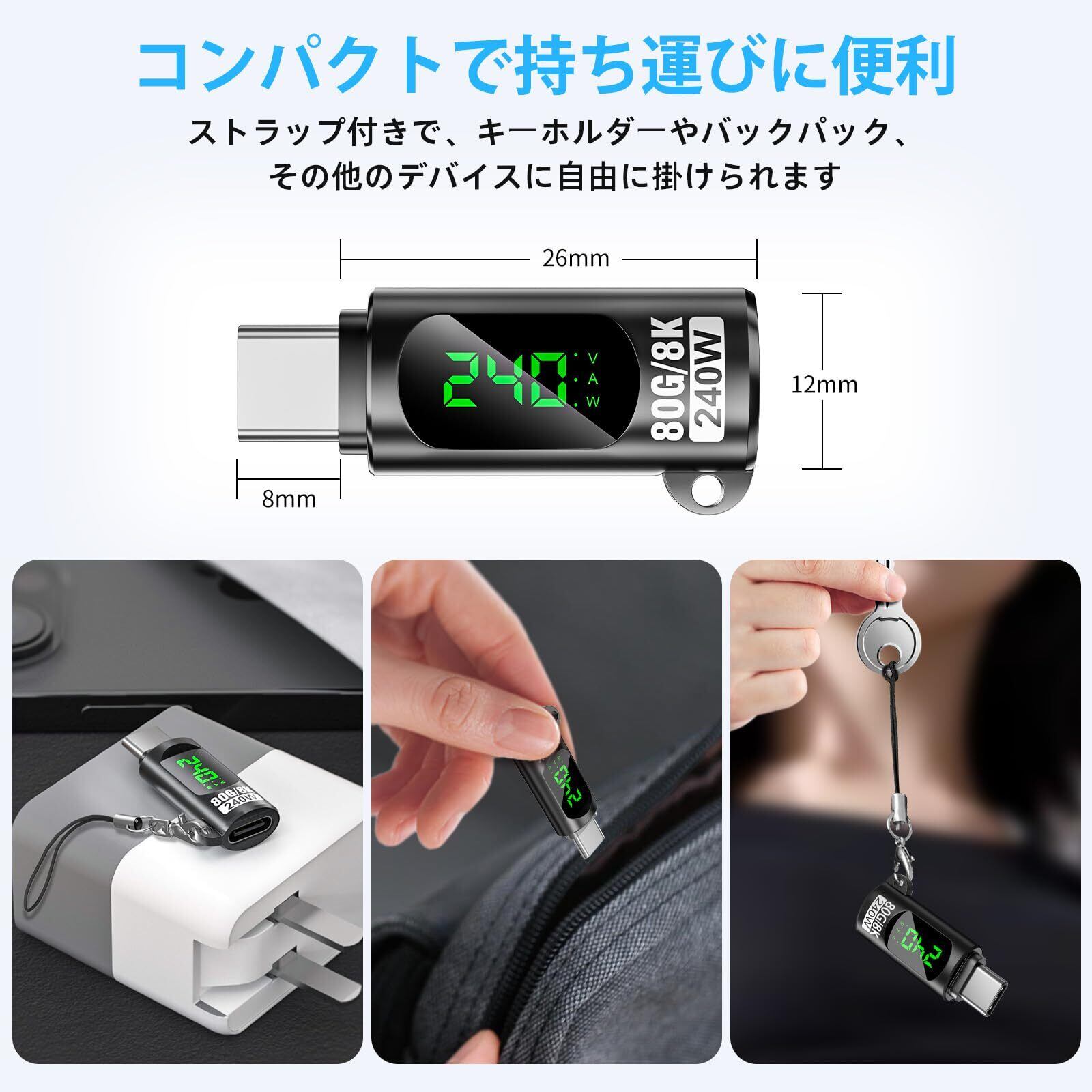 USBC 電流電圧チェッカー 双方向 USB C パワーメーター、2個セット 電圧・電流・電力LEDデジタル表示、240W アダプター電力計テスター、80Gbpsデータ転送対応 Type C延長コネクタi-Phone 15/16/17、Mac-Book、i-Pad など対応 USB-Cケーブル/デバイス用、8K/60Hz、サンダーボルト5に対応、金属シェル、ストラップを付属