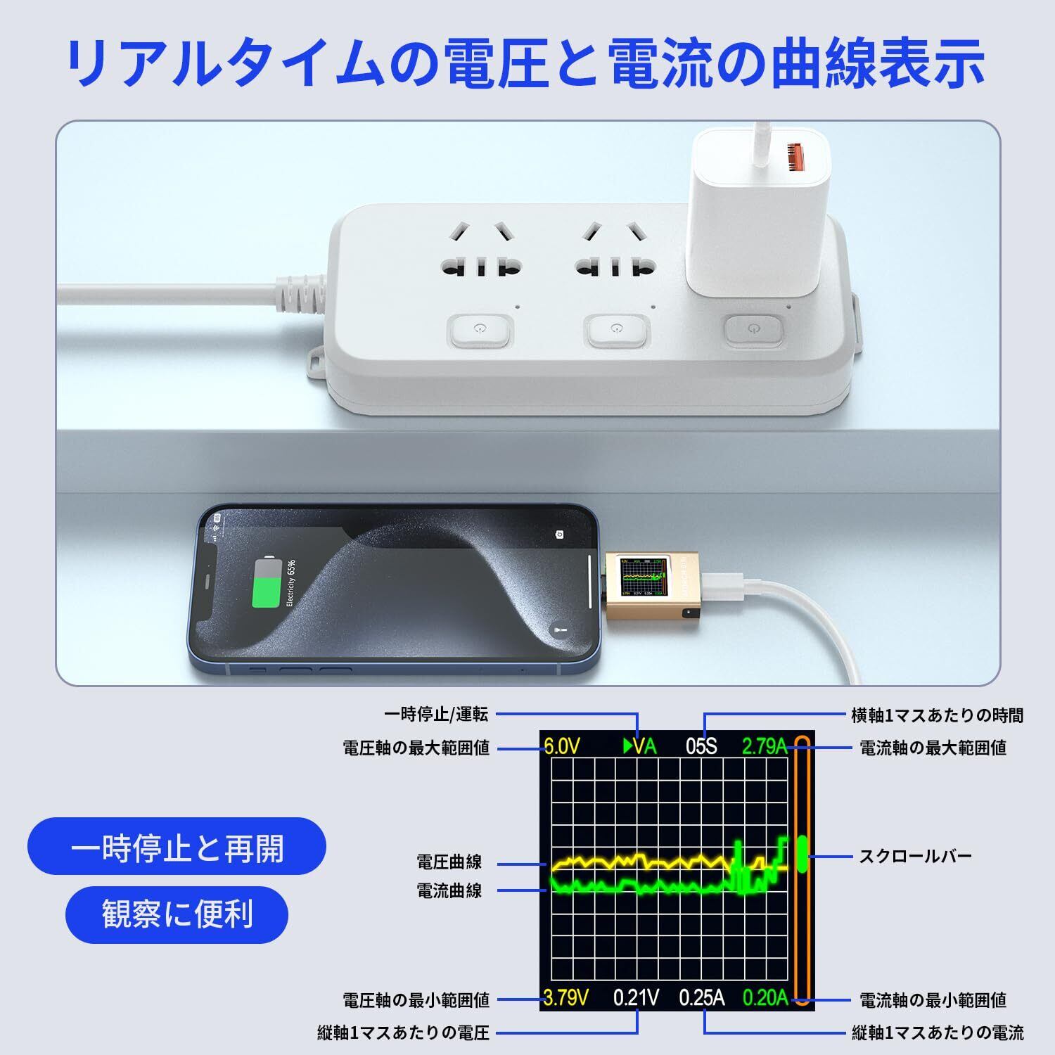 曲線表示:電流テストは、カーブ表示機能を搭載しており、電圧と電流の変動幅を観察できます。充電状況をより直感的かつ明確に確認することができます。