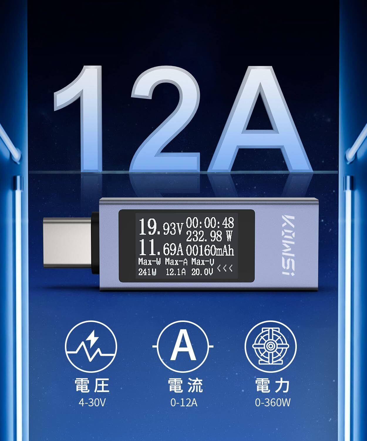 YOJOCK USBC電流 電圧チェッカー 双方向・メタル筐体・多機能表示 Type-C電圧・電流テスター 4-30V 0-12A パワーデジタルテスター