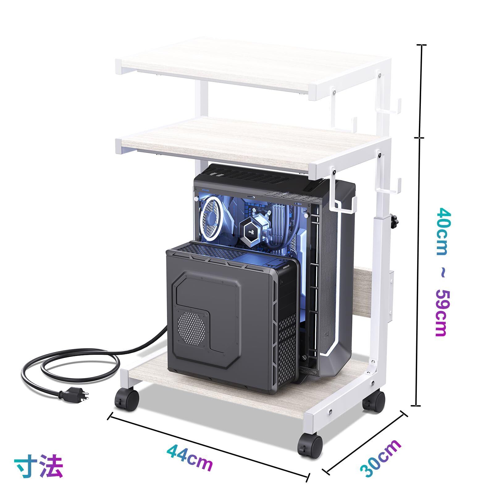 CPUスタンド PCラック パソコンラック 高さ調節 コの字型サイドテーブル キャスター付き 昇降式テーブル pcワゴン キャスター付き 収納テーブル CPUワゴン 2段木製の棚板 木目調 ソファー/サイド/オフィス用/ベッドルーム用/ゲーム用 組立品 耐荷重50kg (ホワイト, 44×奥行30×高さ44-59.5㎝)