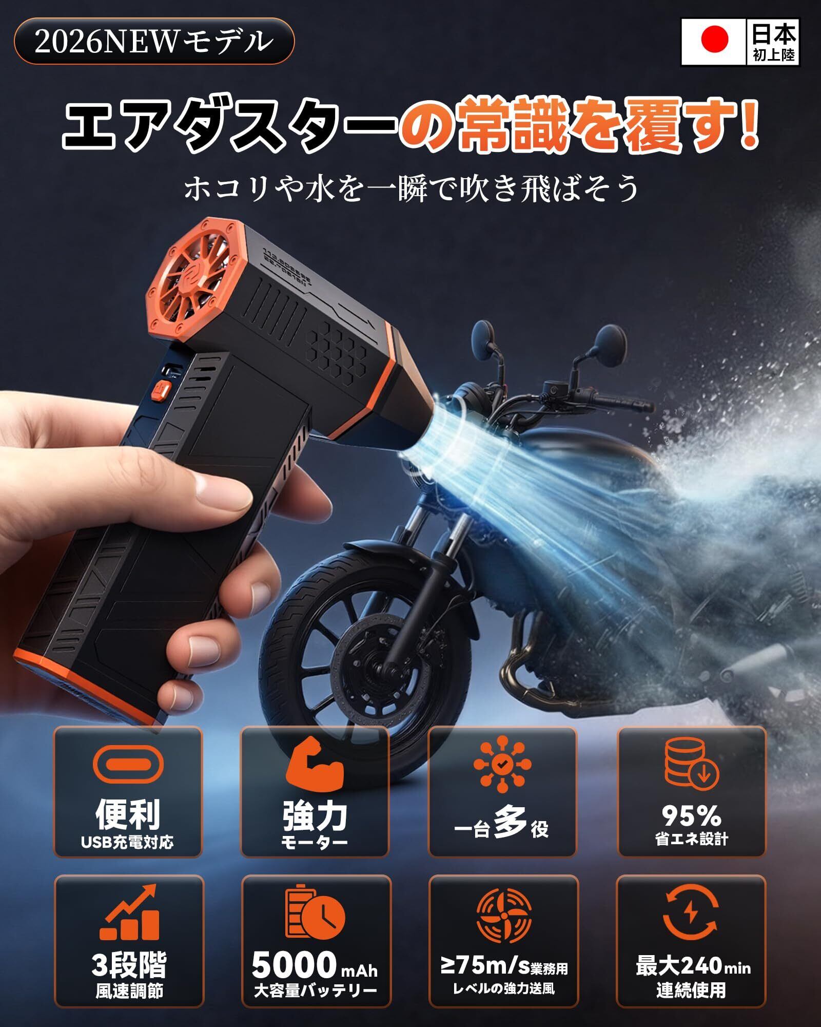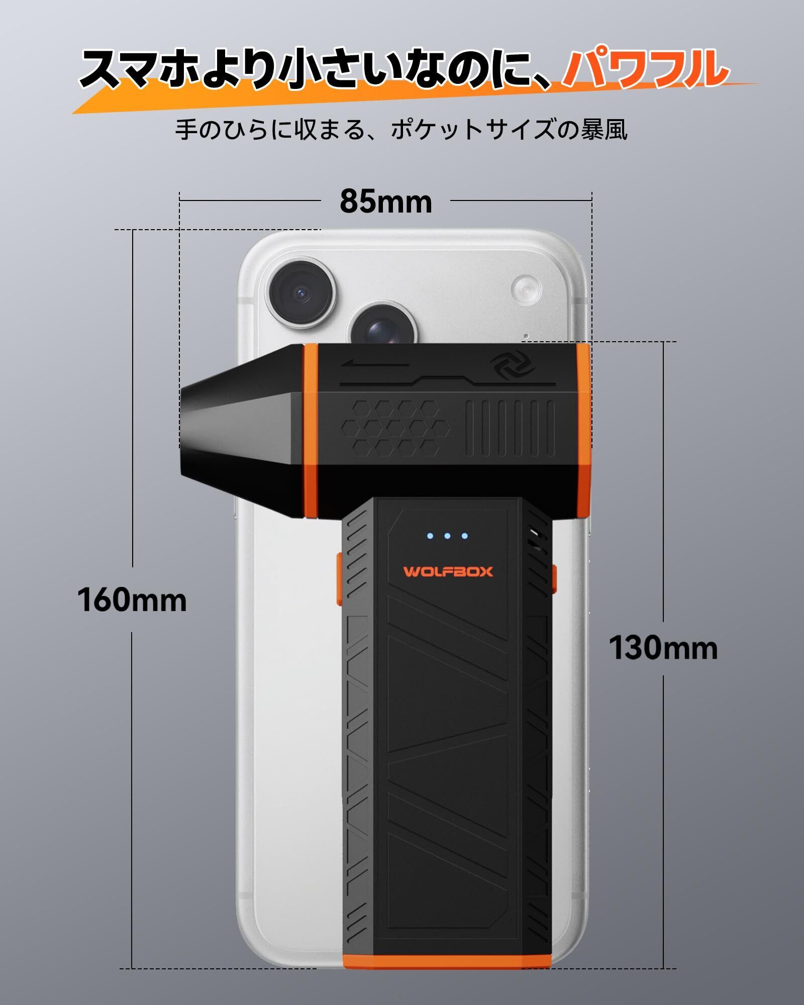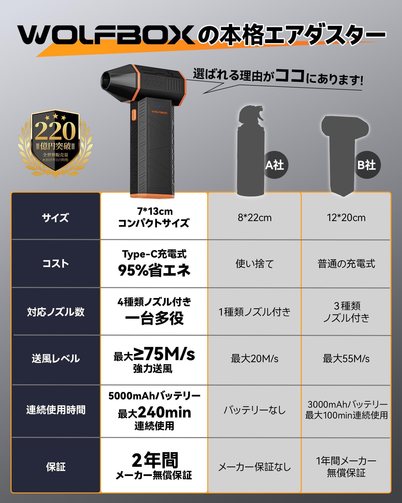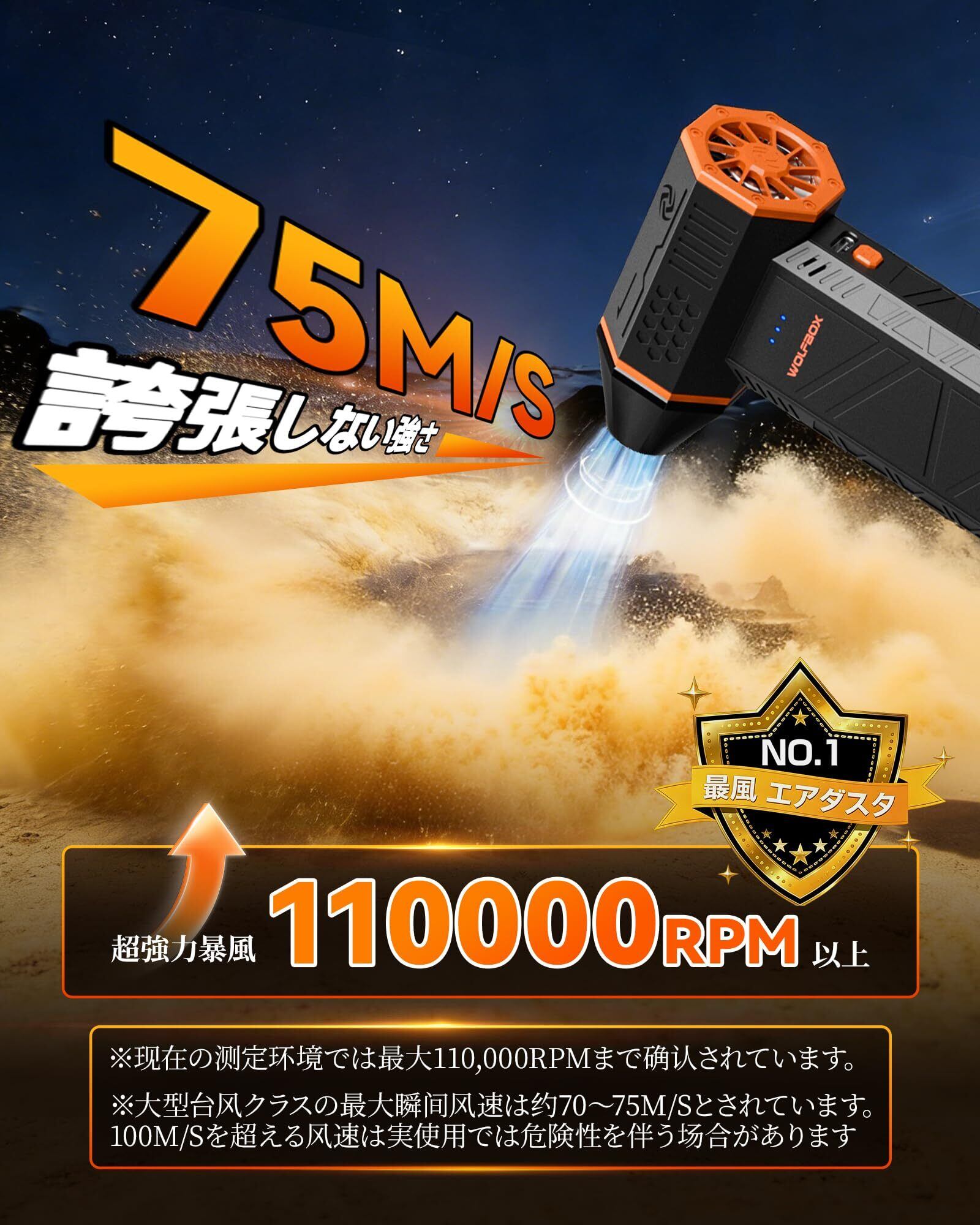【数量限定】WOLFBOX エアダスター 電動 強力ブロワー 洗車 最大風速75m/s以上 204g超軽量 11万回転5000mAh大容量 240分連続稼働 4種ノズル付き 3段階調整 USB充電式 一台多役 年寄りも簡単に使える PC掃除/キャンプ/空気入れ 2年 日本語書付 (ブラック/日常最適)