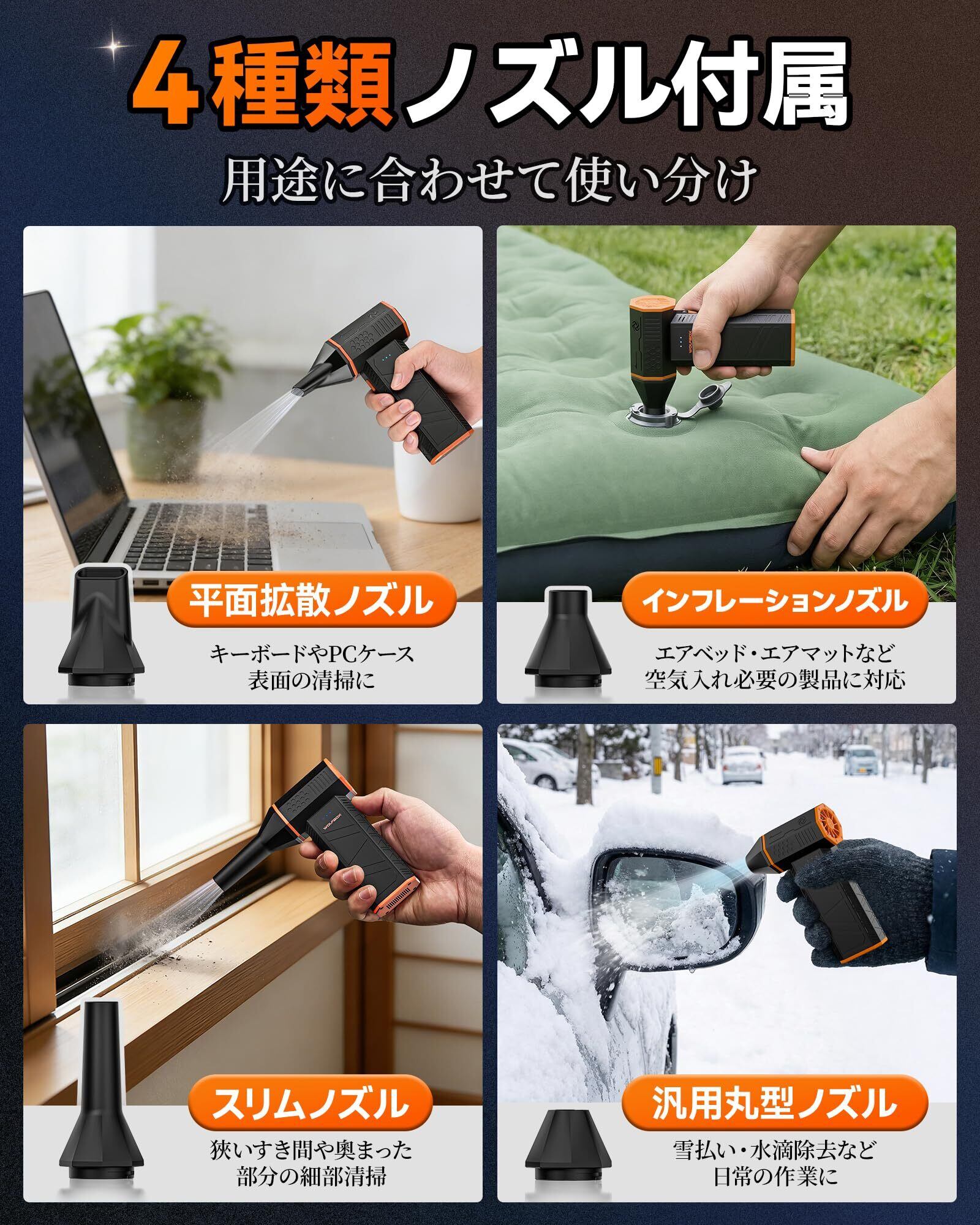 【4種類ノズル付属・繰り返し使えるエコ設計】用途に合わせて使い分けできる4種類の専用ノズルを付属。 PC内部やキーボード、カメラ、エアコン吹出口の清掃から、空気入れなど幅広いシーンに対応します。充電式で繰り返し使用できるため、使い捨てエアダスター缶のようなガス臭や空き缶ゴミが発生しません。ランニングコストを抑えながら、環境にも配慮した実用的なクリーニングツールです。