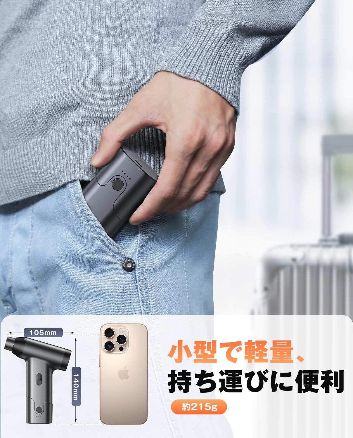 【コンパクト&持ち運びやすい】エアダスターのサイズは140×105×36mm、重量はわずか215gで、手のひらサイズのため片手でも持ちやすいです。また、収納に便利な収納ボックスが付属しています。このエアダスターはコンパクトなデザインで軽量なため、持ち運びやすく、家庭内のPC掃除や、外出先の洗車にも、掃除機を使うのにも最適です。