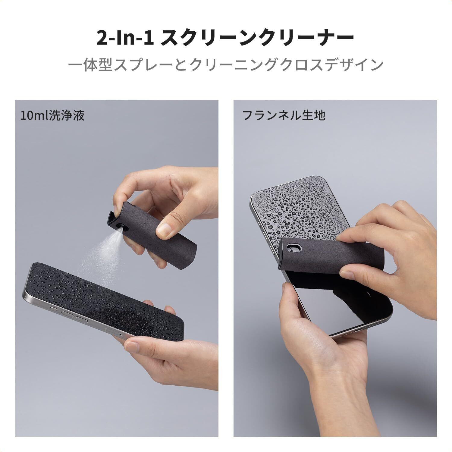 【一体型スクリーンクリーナー】この画面クリーナーはスプレー・マイクロファイバー一体型設計なので、高品質なマイクロファイバークロスを使用、色落ちも毛羽落ちもしません。液晶画面に超微細なスプレーで均一に吹きかけて、画面の汚れやホコリ、指紋などをふき取るだけで新品のようなツヤを取り戻し、ガンコな汚れも落とします。