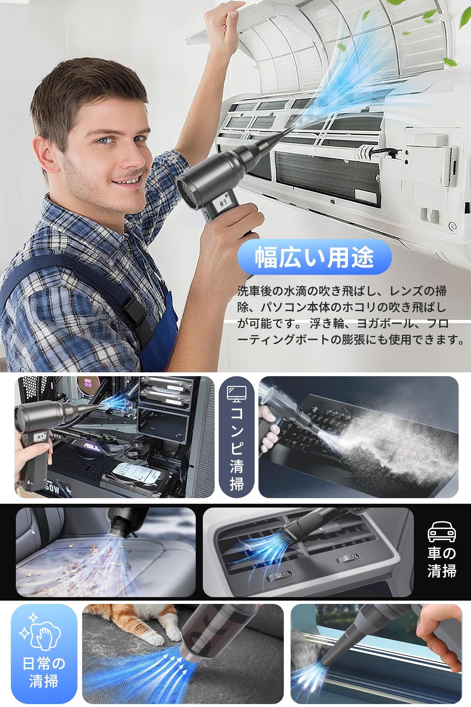 【様々なシーンで使用可能】 キーボードの隙間、精密機械、クリーナーやフィルター、メッシュの椅子、洗車後の水滴や雪、車内、ラグ、家具の隙間、エアコン、窓のサッシ、サーキュレーターなど、幅広い場所で活用できます。