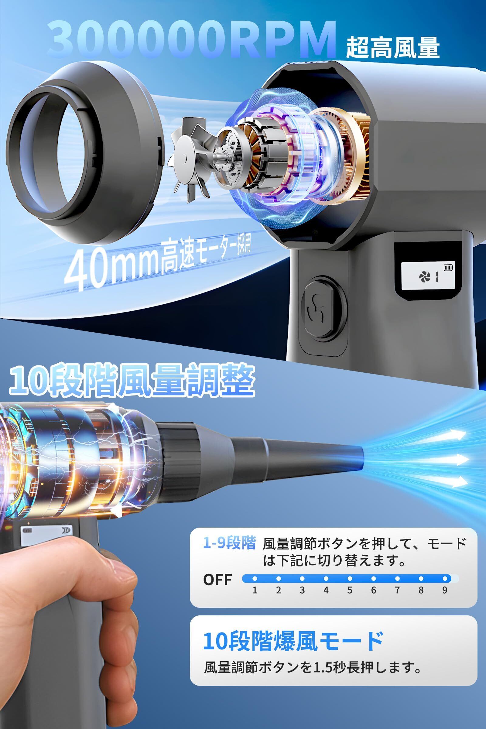 【10段階風速調整・LEDライト搭載】 10段階調整タイプの風量調整機能を搭載して、微風から爆風まで、作業環境や清掃のニーズに合わせて最適な強度を選べます。 10段階の風量調節(微風〜強風〜爆風)で精密機器からキャンプの着火補助として薪の火起こし効率を飛躍的に向上。場合に応じて弱風モードではエアコンを掃除して、強風モードではBBQコンロの炭起こしに活用、爆風モードでは自動車の積雪を吹き落とす。便利なLEDライトを搭載して、暗い場所や光の届きにくい隙間の清掃も簡単です。 ●風量調節ボタンを押して、モードは「OFF→1→2→3→4→5→6→7→8→9」に切り替えます。10段階爆風モード:風量調節ボタンを1.5秒長押します。