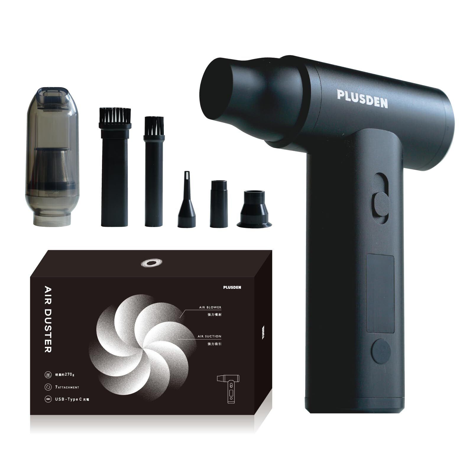 PLUSDEN (プラスデン) エアダスター 2in1 噴射 × 吸引 機能搭載 スマホサイズで風速35m/s ブロアー 強力 充電式 PC掃除 キーボード カメラ 車内 アウトドアー (ブラック, 小型)