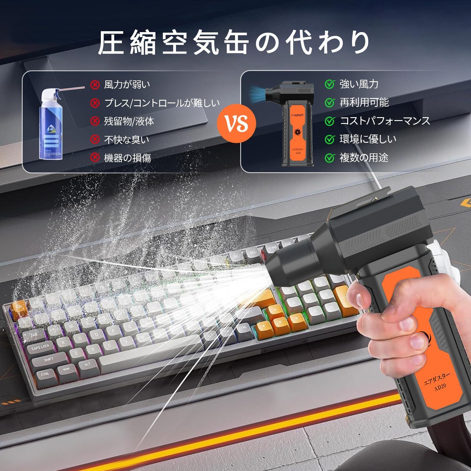 【エアダスター缶の代替品&環境配慮設計】一度電源を入れれば連続噴射が可能で、お好みの場所を 掃除 することができます。 キーボード の隙間、精密機器、 エアコン 、 車 内、窓のサッシ、サーキュレーターなど、あらゆる場所で使用可能です。充電式で繰り返し使えるため、経済的で安全な商品です。通常のエアダスターに比べ、繰り返し購入する必要がなく、 ガス の匂いや空き缶の処理、火気による危険がありません。