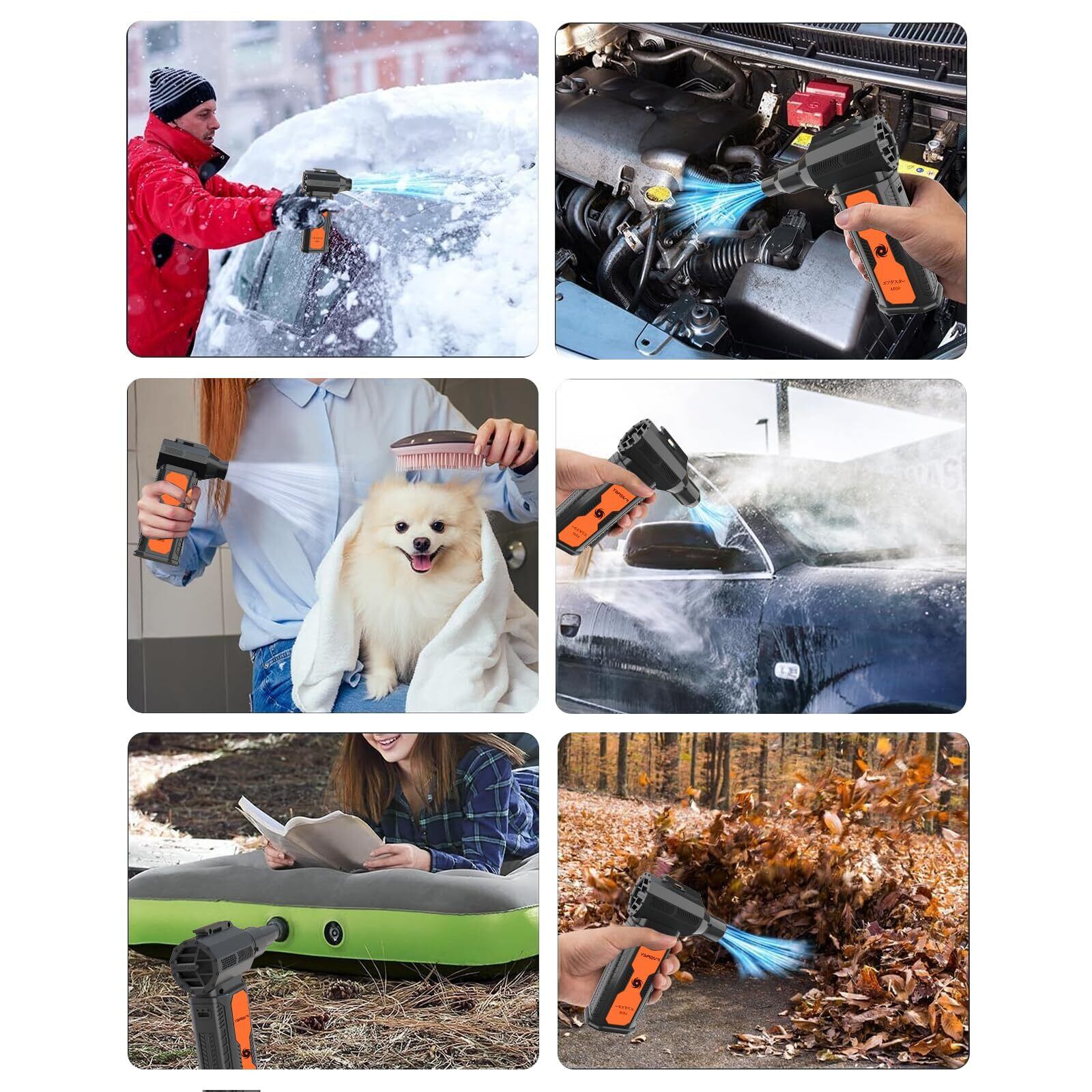 【3種ノズル+6ブラシの完全装備】電動エアダスター付属の3種類のノズルと6種類のブラシを組み合わせることで、あらゆる清掃ニーズに対応します。キーボードの隙間、PC周り、卓上、エアコン、火起こし道具、車内、窓のサッシ、掃除機のフィルター、浮き輪の空気入れ、洗車後の乾燥など、あらゆる場所で使用可能です。合計4種類の 風速 を使い分けることができ、使用用途に応じた風力でご利用いただけます。