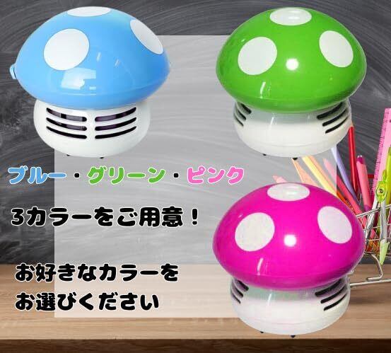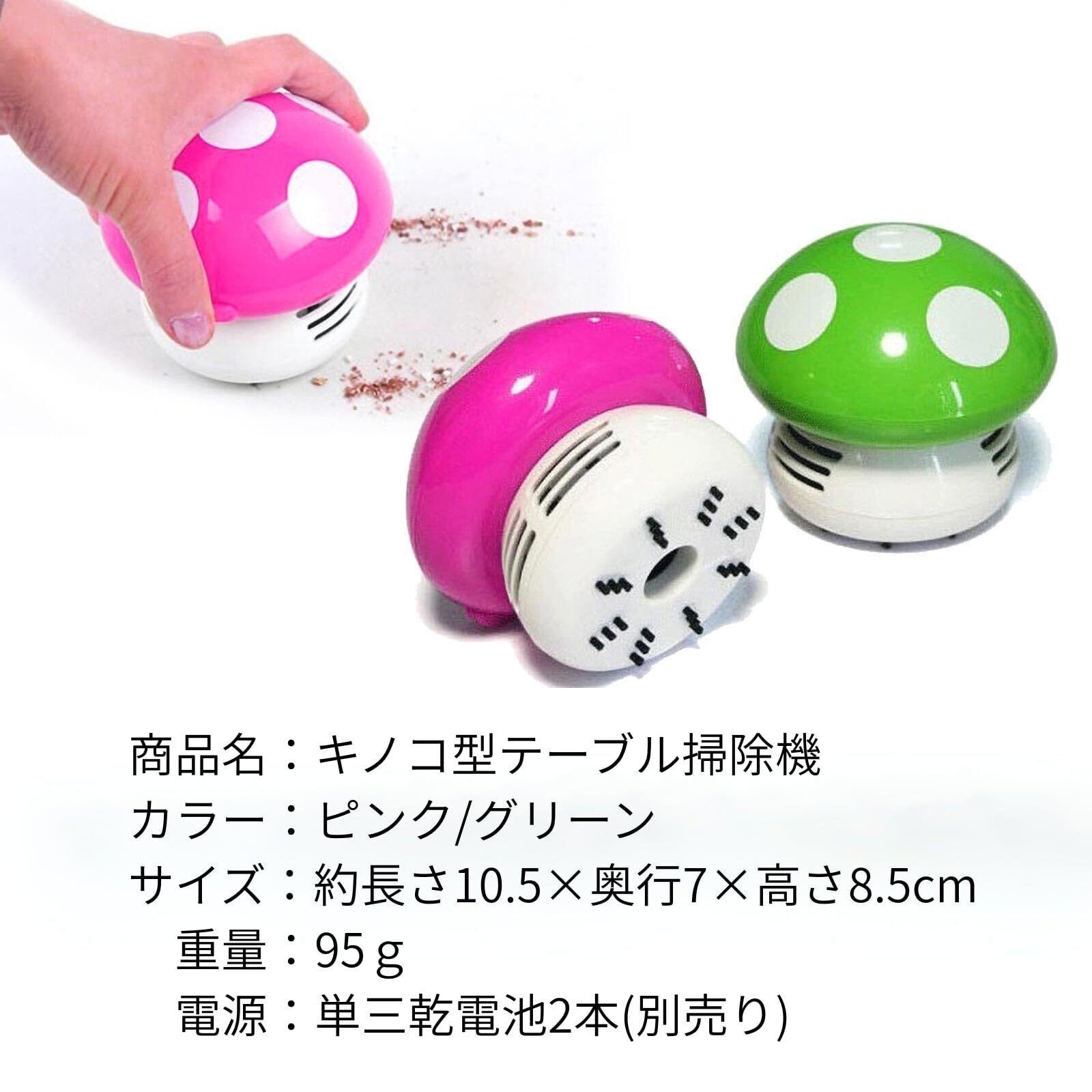 キノコ型卓上ミニクリーナーは、デスク周り、テーブル、机、PC周りのお掃除に便利な手のひらサイズのコードレス掃除機。消しゴムのかすなどの小さなゴミ、ほこり、パンくずなどを強力に吸い取ります。ピンクとグリーンの2色。
