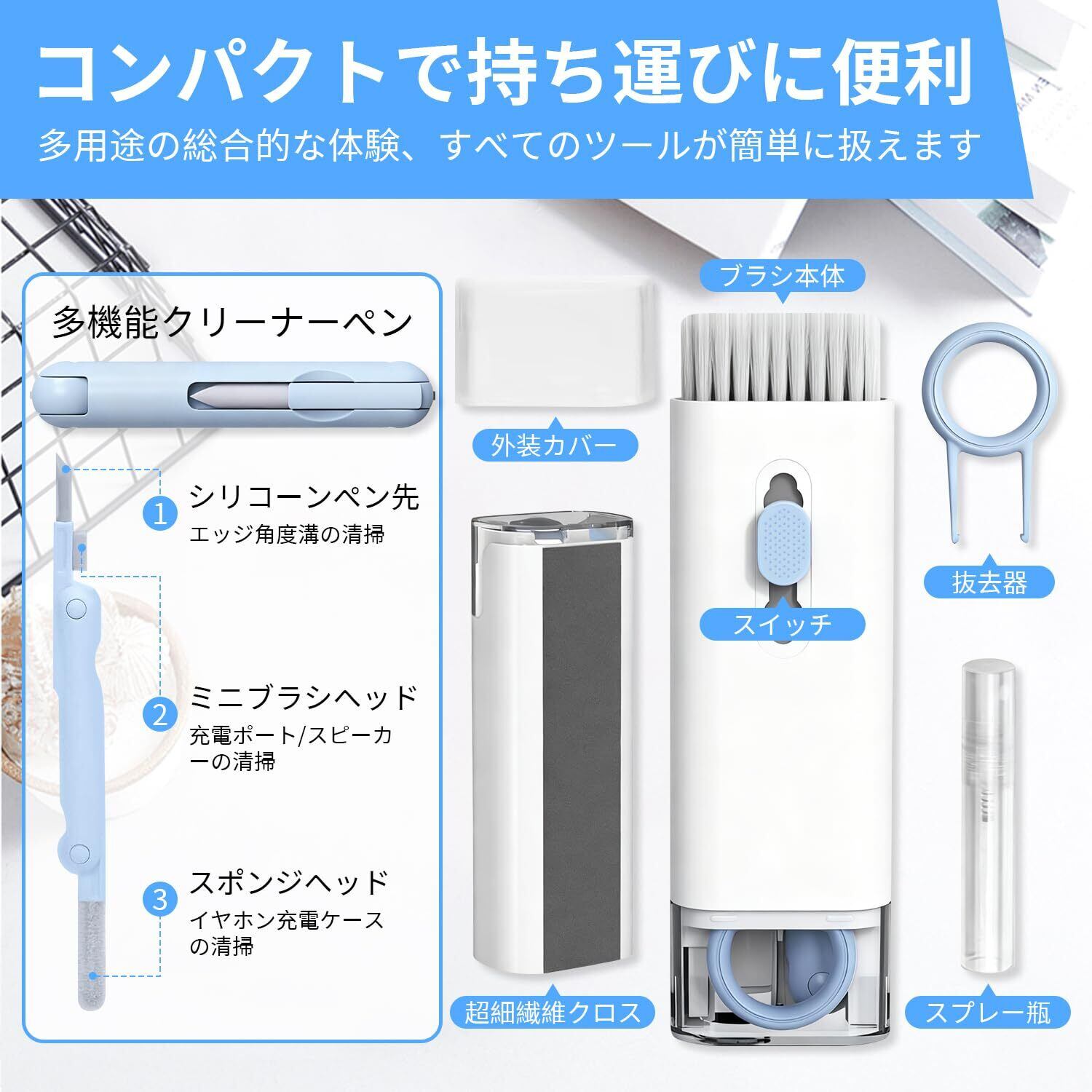 【7点機能セット内容】清掃ブラシ 、画面クリーニングクロス 、キーボードクリップ 、スプレーボトル、イヤホン充電ケース用ブラシ 、イヤホン出力口用シリコンチップブラシ 、スマートフォンスピーカー用ブラシ(クリーニング液は別途購入必要)。本セットにはクリーニング液は含まれませんのでご注意ください。