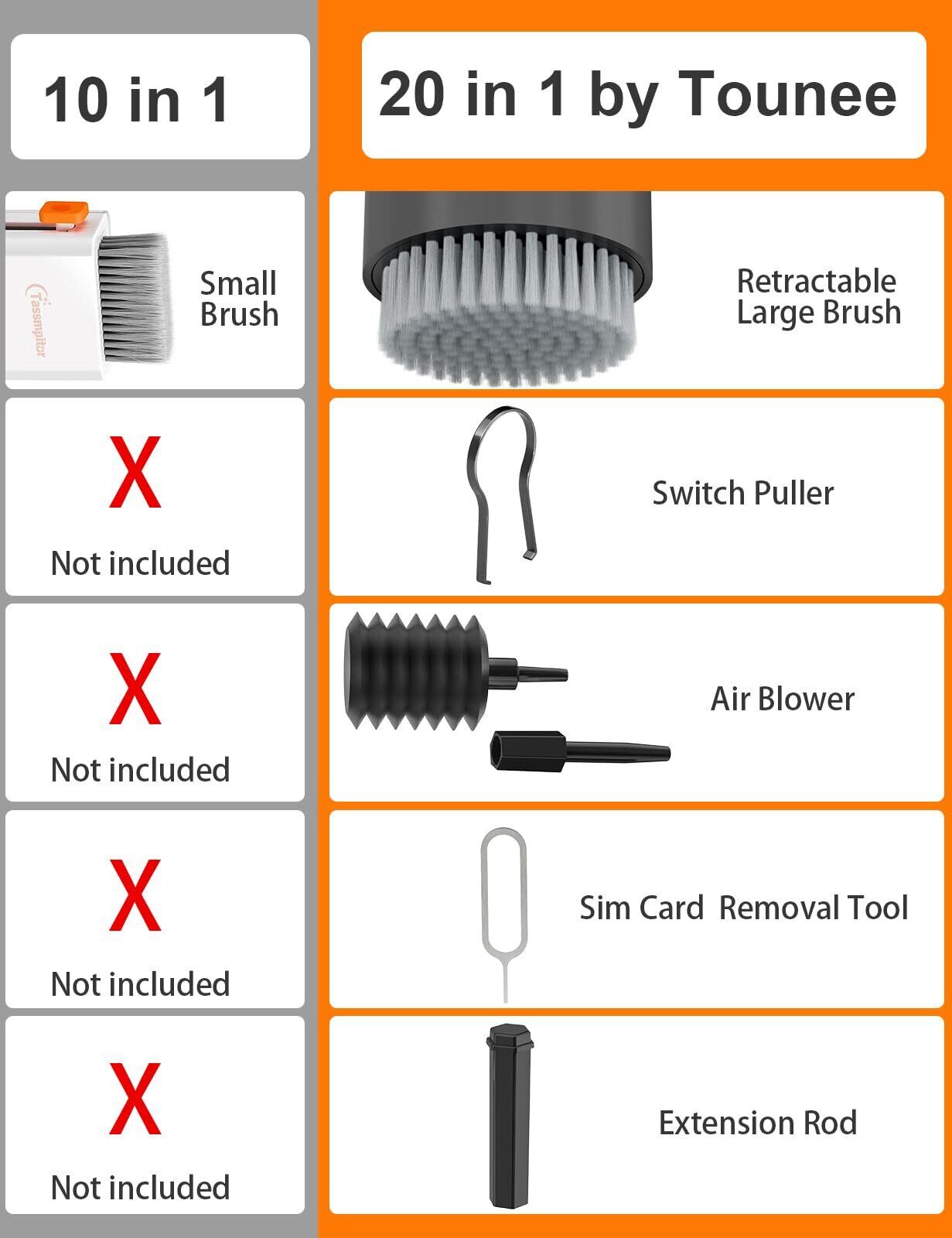 20 in 1 キーボード クリーナー キット: Tounee のコンピューター クリーニング キットには、格納式キーボード ブラシ、キーキャップ プーラー、シャフト プーラー、エア ブロワー、Airpod クリーナー ペン、フロッキング スポンジ、ミニ ソフト ブラシ、レンズ ブラシ、イヤホン ケース クリーニング ブラシとカメラ ブラシ、スクリーン クリーナー スプレー、マイクロファイバー ファイバー クロス、ヘッド ブラシ、カード ピックアップ ピンなど、20 種類以上のアクセサリが含まれています。この電話クリーニング キットには延長ロッド デザインも装備されており、より長いクリーニング ツールのニーズにも対応します。