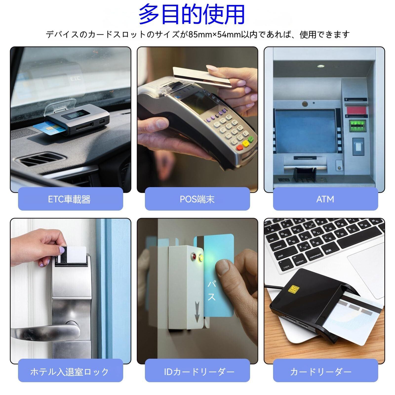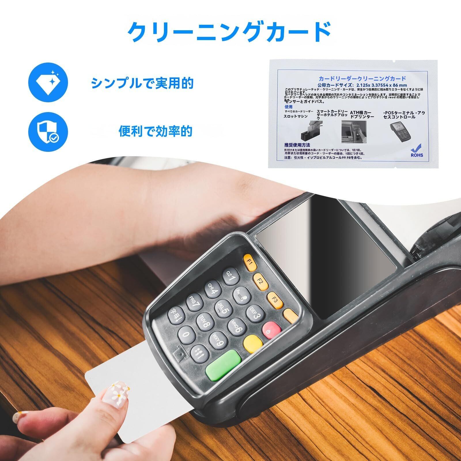 【幅広い機器対応のクリーニングカード】ETC 車載器(旧モデル含む)、クレジットカードリーダー、IC カードリーダー、POS 端末、ATMなど磁気カード・IC カードのスロット全般に対応。カードマシンクリーナーとして家庭用~業務用まで、多シーンで活用できるETC クリーニングカードです。