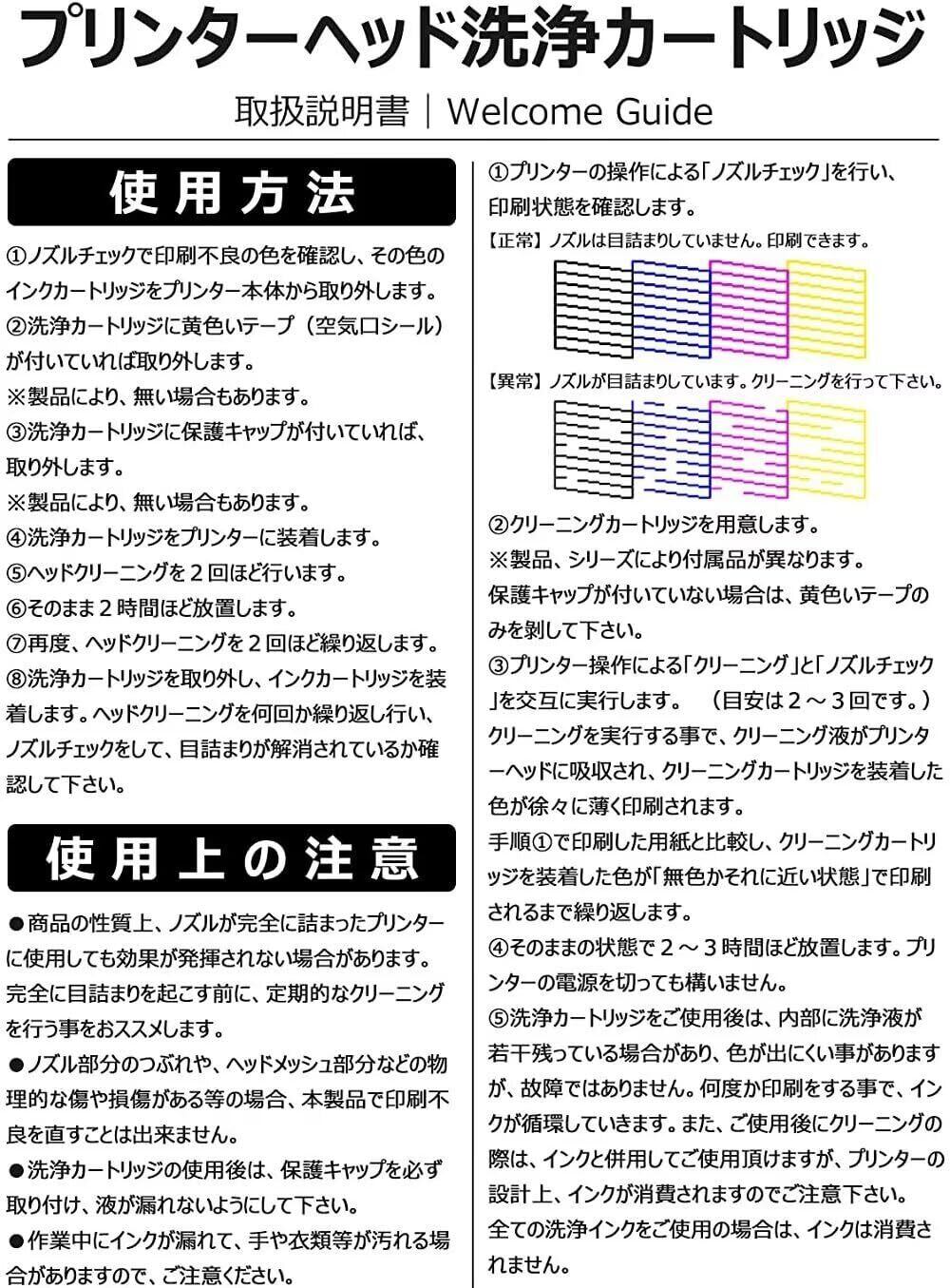 【製品仕様】当製品は洗浄インクとなりますが、純正品がインクの残量表示機能・ICチップ付きの商品は同じ仕様で、通常のインクカートリッジと同様のセット方法です。洗浄カートリッジのご使用後は何度か印刷する事で通常のインクが循環していきます。クリーニング後の最初のうちは色が出にくい事がございますが、洗浄液が残っている場合があるのでご確認の程お願い致します。※物理的な傷や損傷がある等の場合は、本製品では印字不良を改善することは出来ません。