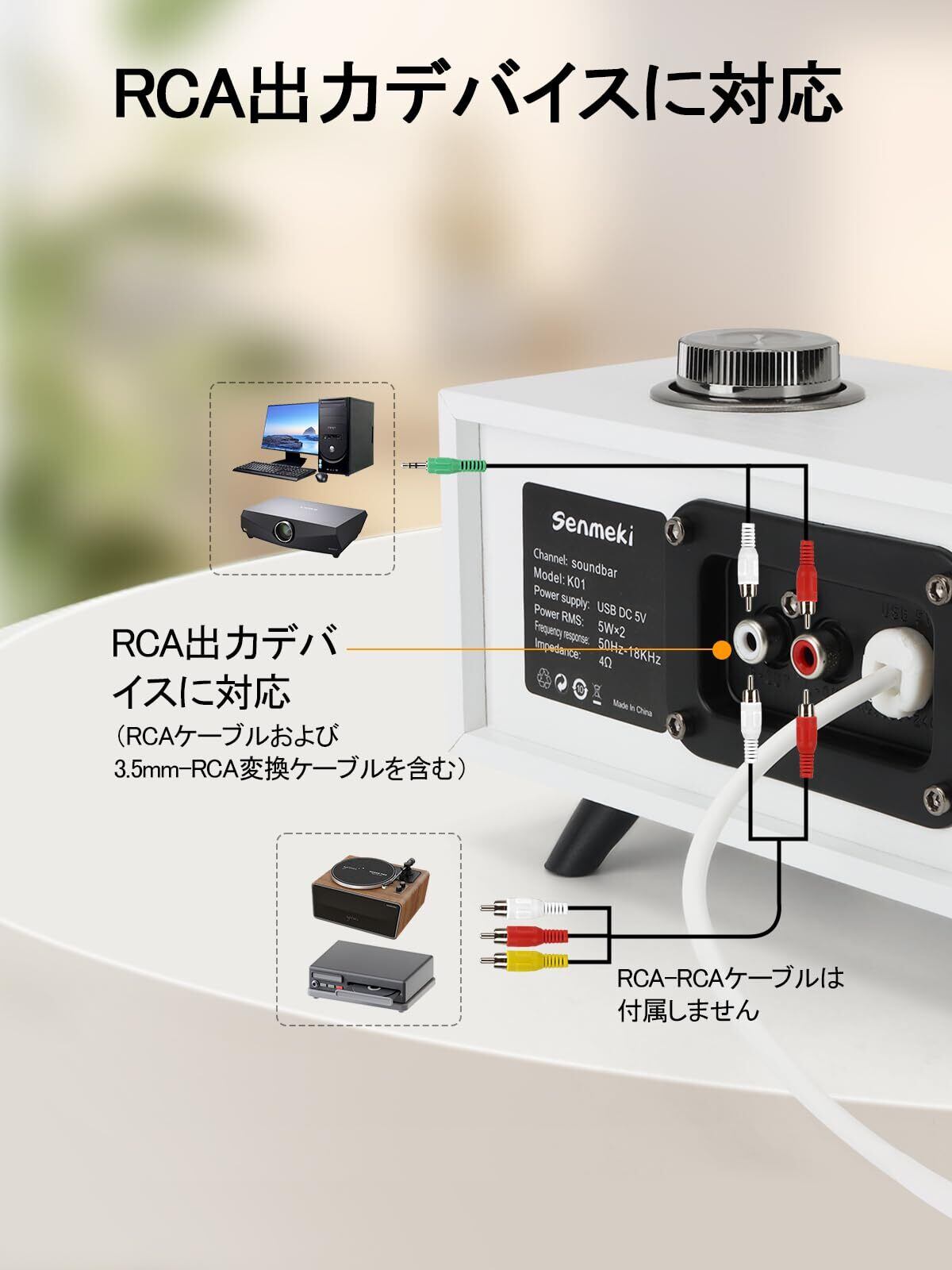 【新旧デバイスを包括的に接続】付属の3.5mm→RCAオーディオケーブルで、旧式のノートPC、プロジェクター、レコードプレーヤーなどにも簡単接続。さらに背面にはRCA入力端子を装備し、DVDプレーヤーやその他のオーディオ機器との直接接続も可能です(注:RCA⇔RCAケーブルは別途ご用意ください)。