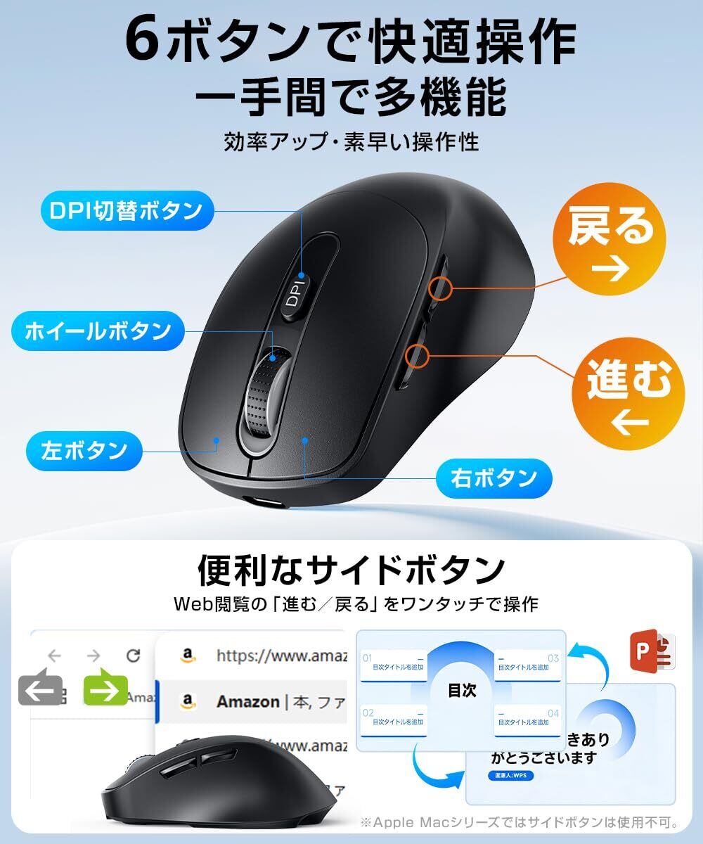 【5ボタン搭載|作業効率が上がるマウス】戻る・進むボタン搭載の5ボタンマウス。800/1200/1600DPI切替対応で、用途に応じた操作が可能なマウス bluetoothモデルです。資料閲覧やブラウジングが快適なワイヤレスマウスです。
