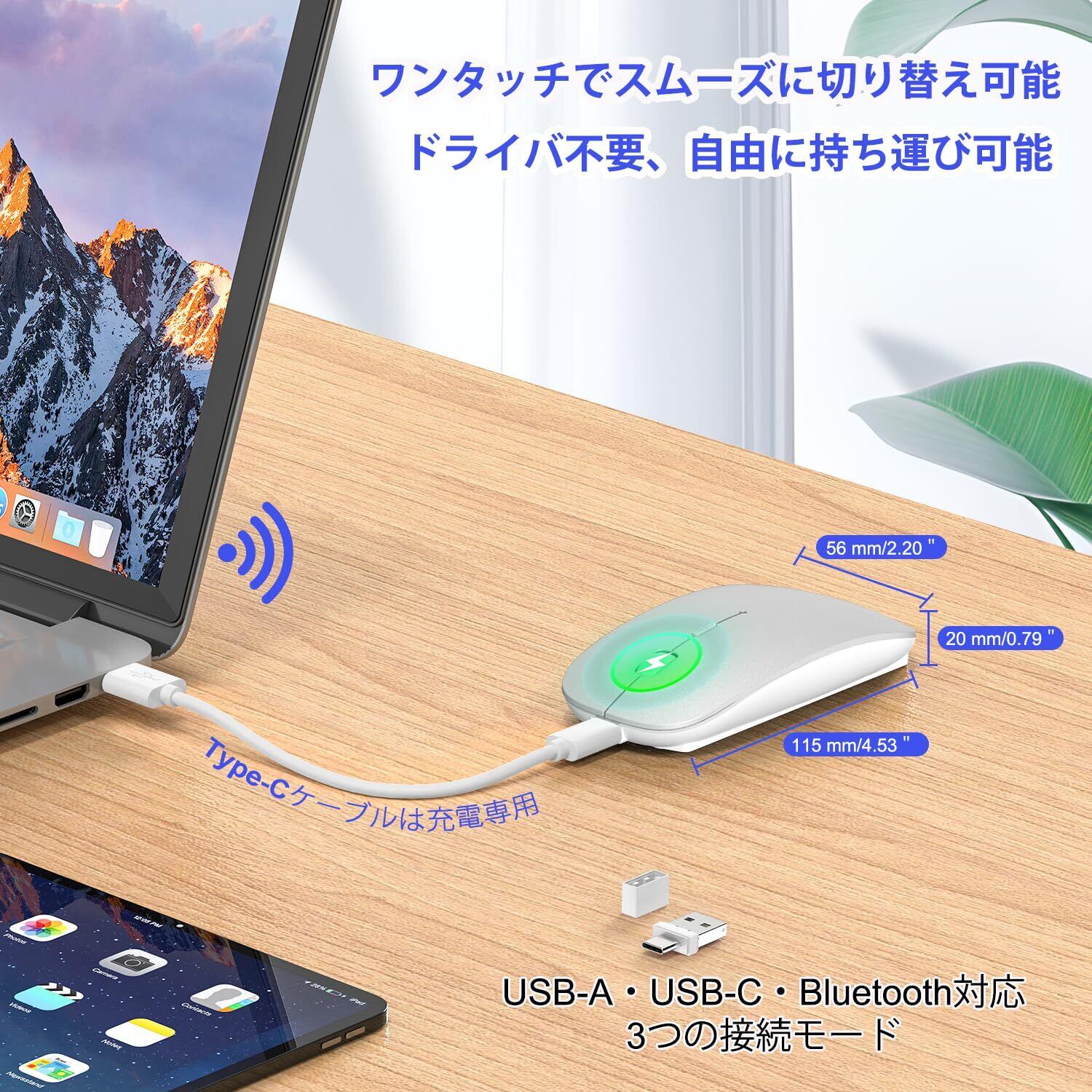 【2022最新】マウス 無線 Bluetooth5.2/3.0+2.4GHz USB-A&USB-C 薄型 静音 小型 Type-C充電ポート ジグラー内蔵 3DPI 高感度 高精度 高耐久性 節電 Mac/Windows/Surface/PC/Macbook/Android/iOS/iPadOSに対応 (シルバー)