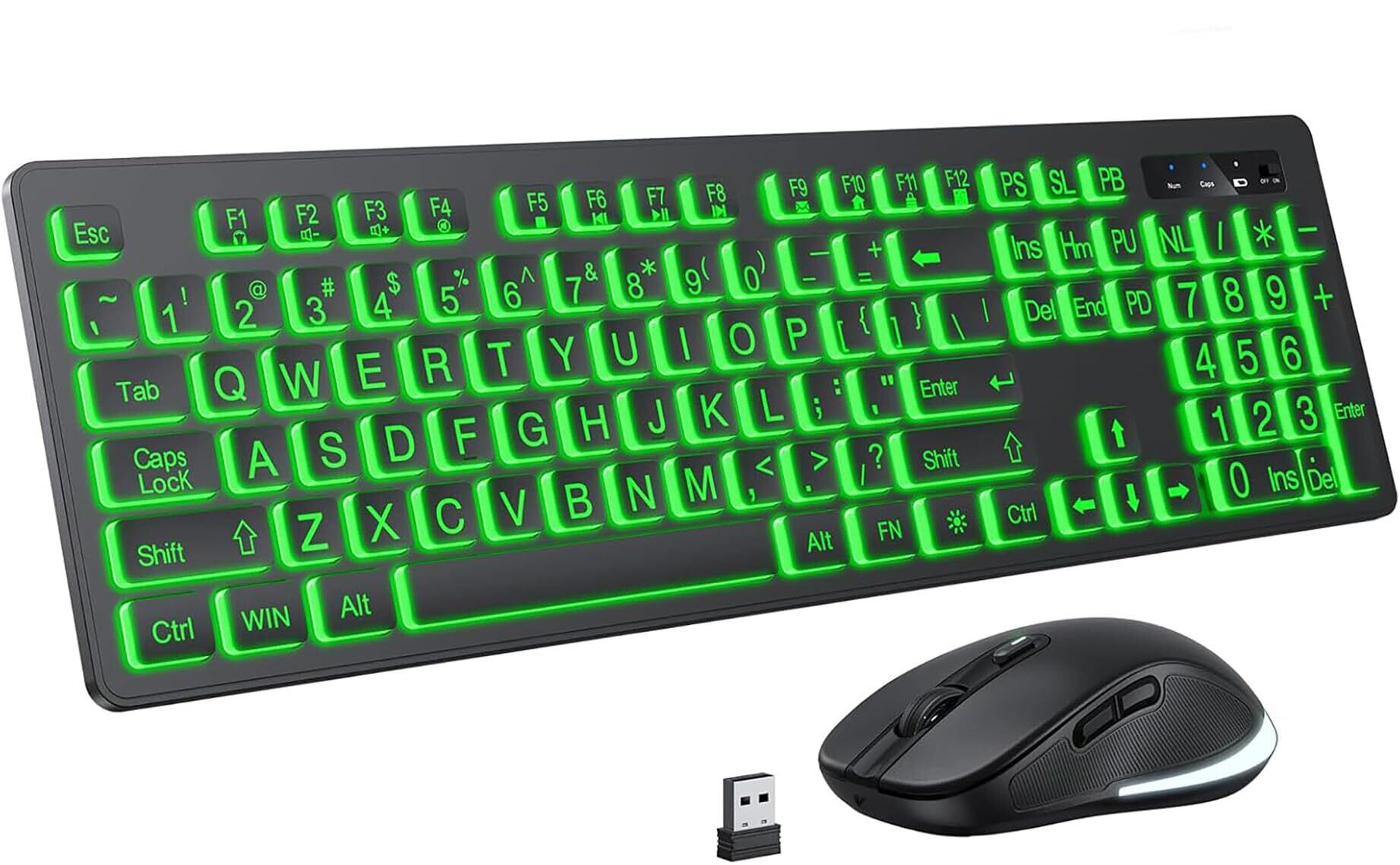 【2022最新】大型文字ワイヤレスキーボード&マウスセット(US配列104キー)7色バックライト搭載・明るさ調整機能付き・可調式キースタンド Windows/PC/ノートパソコン用