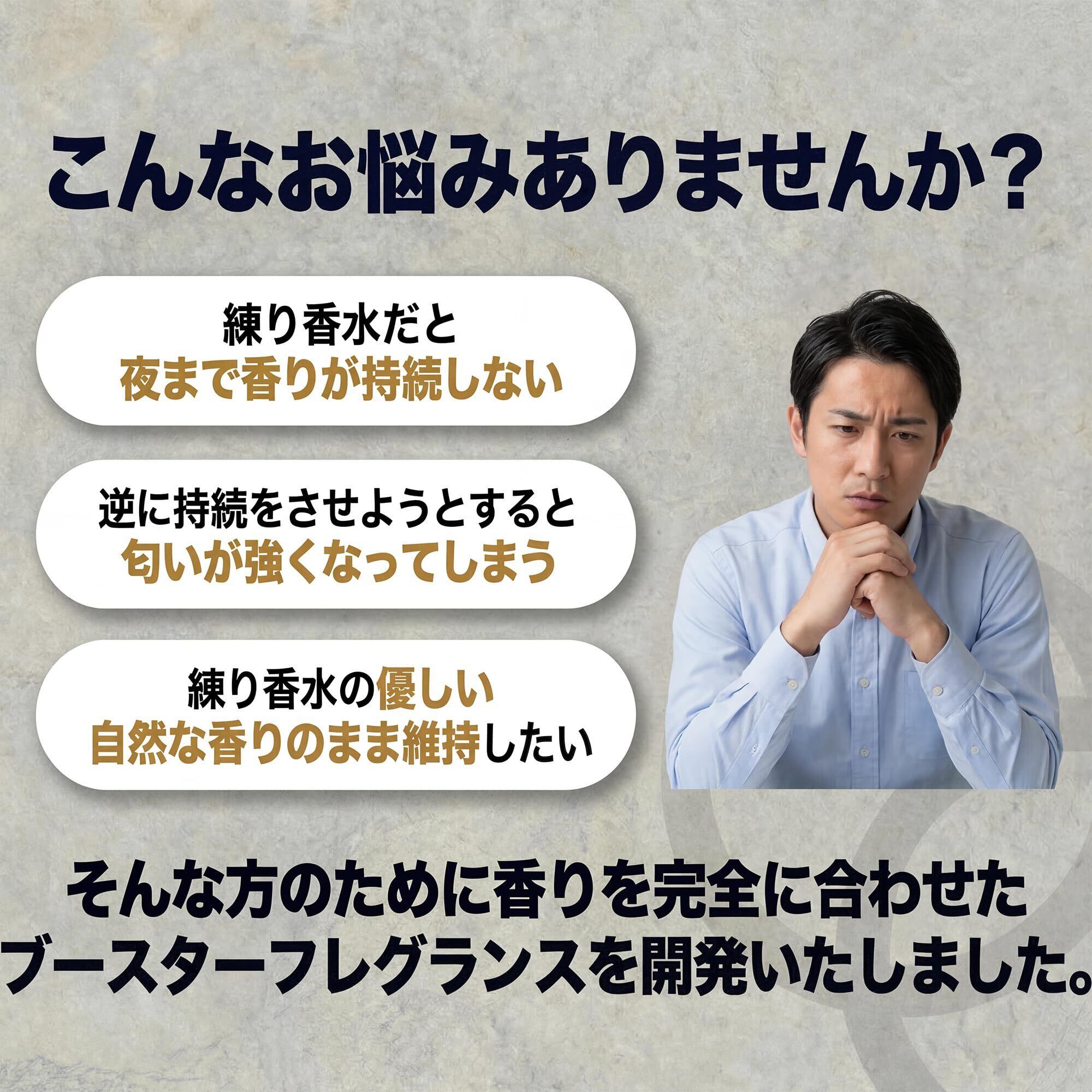 こんなお悩みありませんか?・練り香水だと夜まで香りが持続しない・逆に持続をさせようとすると匂いが強くなってしまう・練り香水の優しい自然な香りのまま維持したい そんな方のために香りを完全に合わせたブースターフレグランスを開発いたしました。
