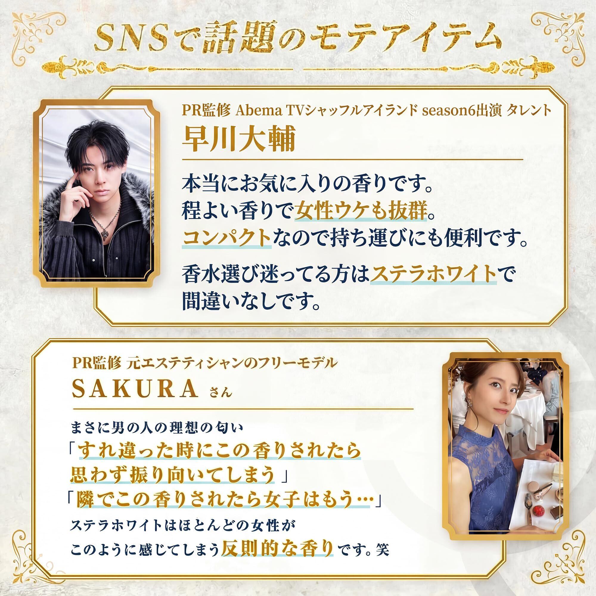 ブースター香水とは?練り香水のメリットは、優しくふんわり香るためシーンを選ばず使え、保湿成分入りで肌に優しく香りの調整がしやすいなところ。そんな練り香水のメリットを活かしたまま 持続時間を伸ばすために開発されたのがステラホワイトブースター香水です。