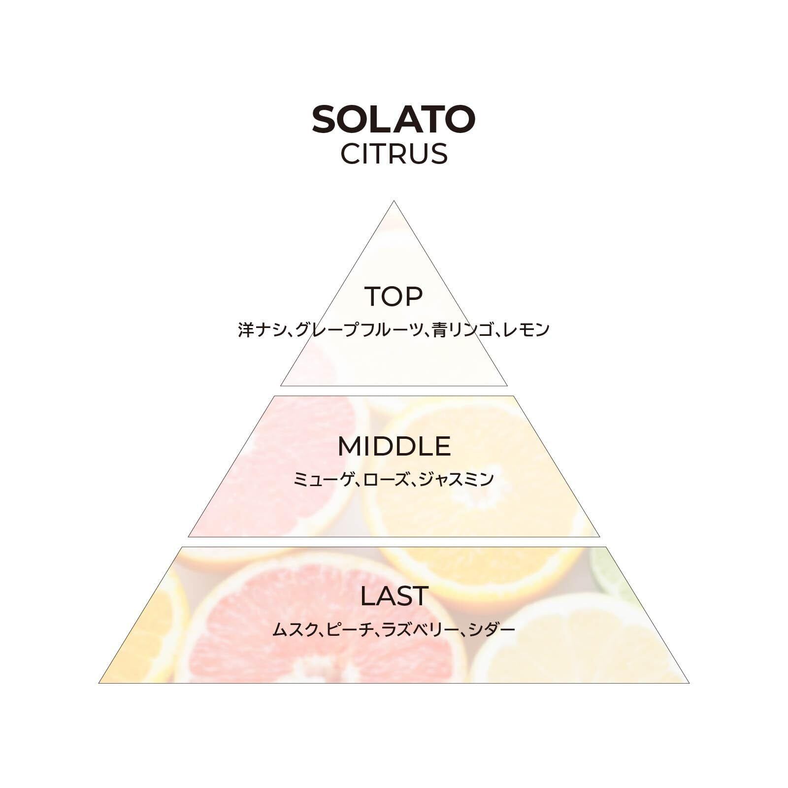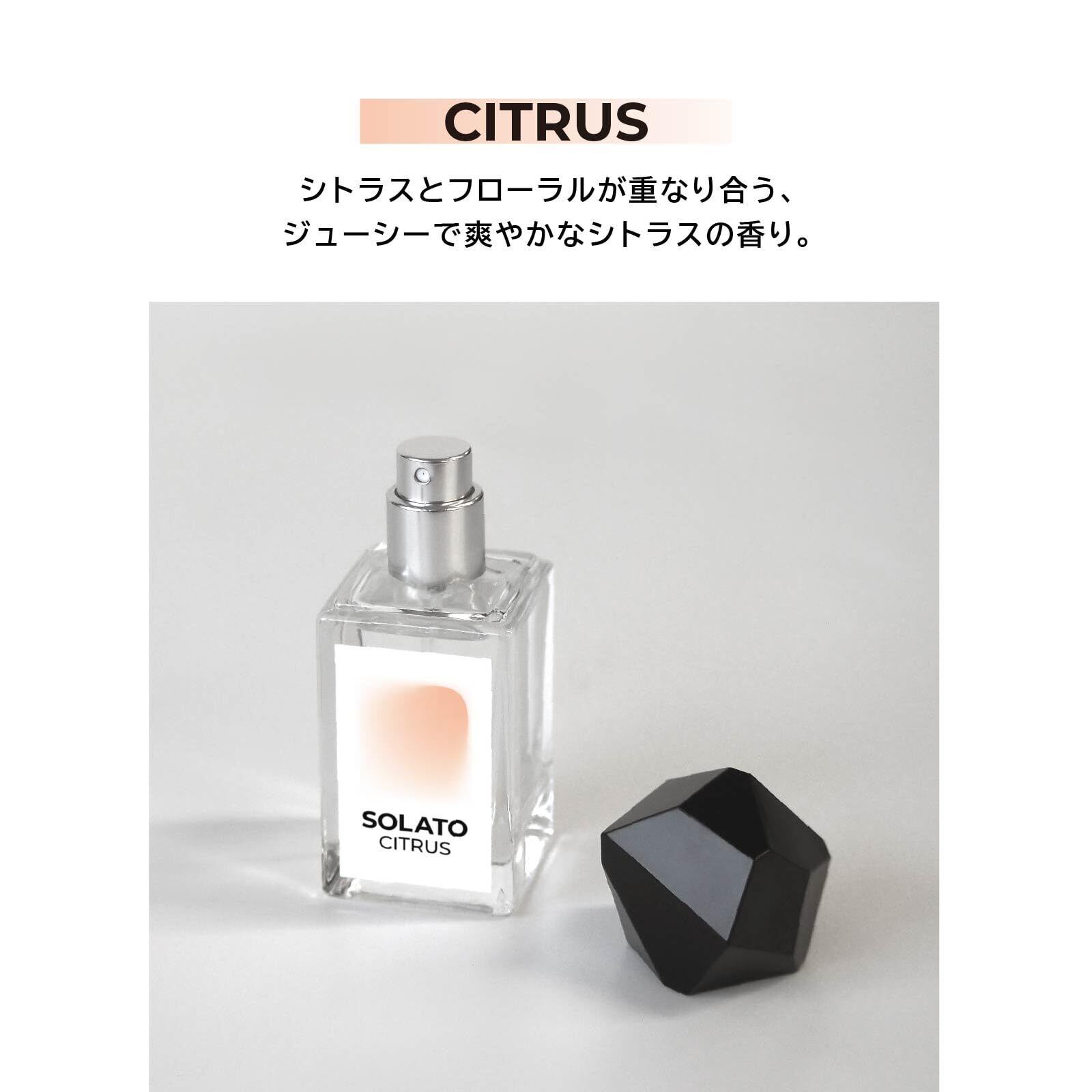SOLATO ― 光と影が交わる静寂の中で生まれたフレグランス。 透明な余韻が空間に広がり、知性と清潔感を纏う香り。 無重力のように澄みわたり、理性的な安らぎをもたらすサボンノート。 研ぎ澄まされた輝きが走り抜け、心に爽快な軌跡を描く。 凛とした透明感と躍動を感じさせる、未来志向のシトラスノート。