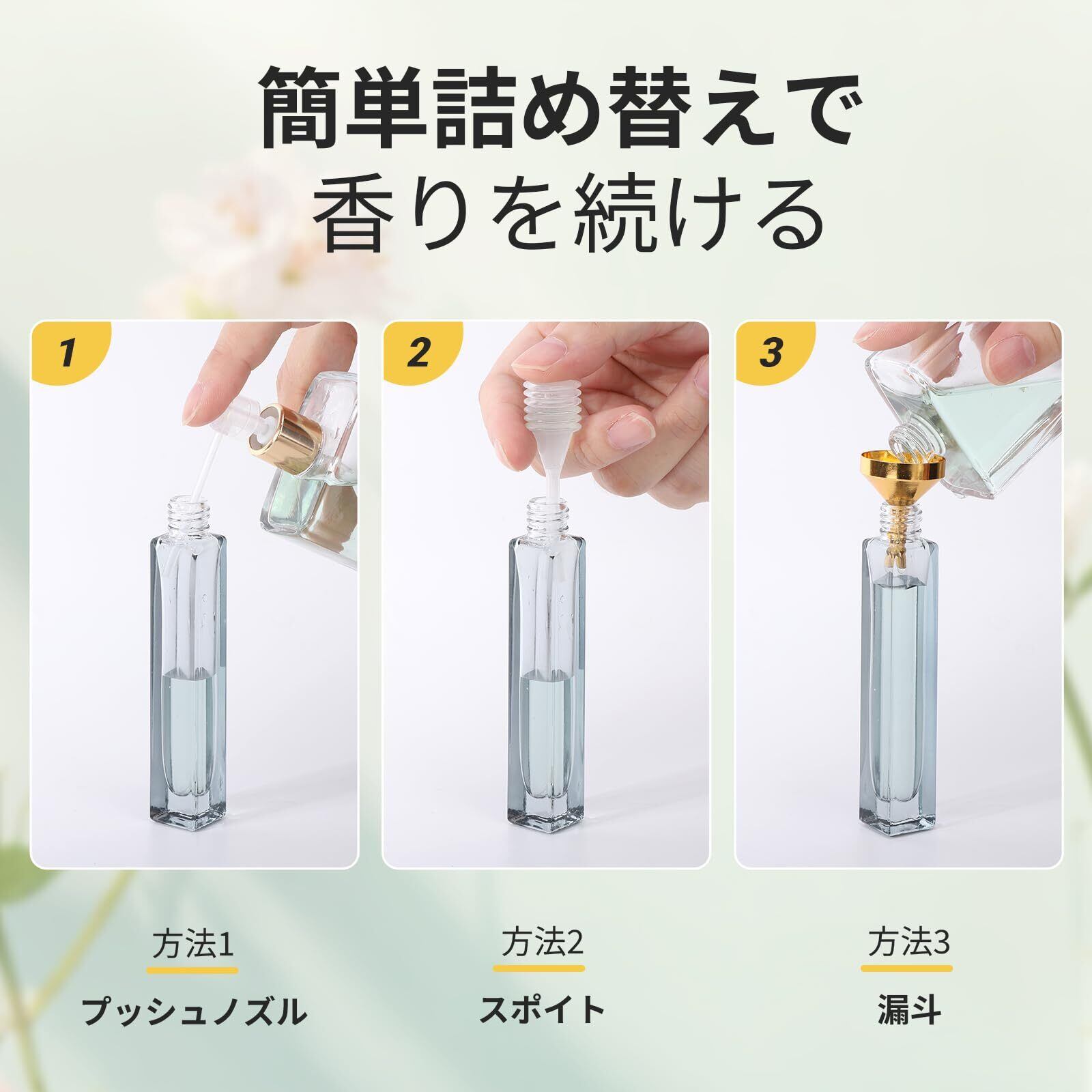 香水以外にも化粧水、アルコールなどの詰め替えに活用可能。 透け感のあるボトルで中身の量を一目でわかります。