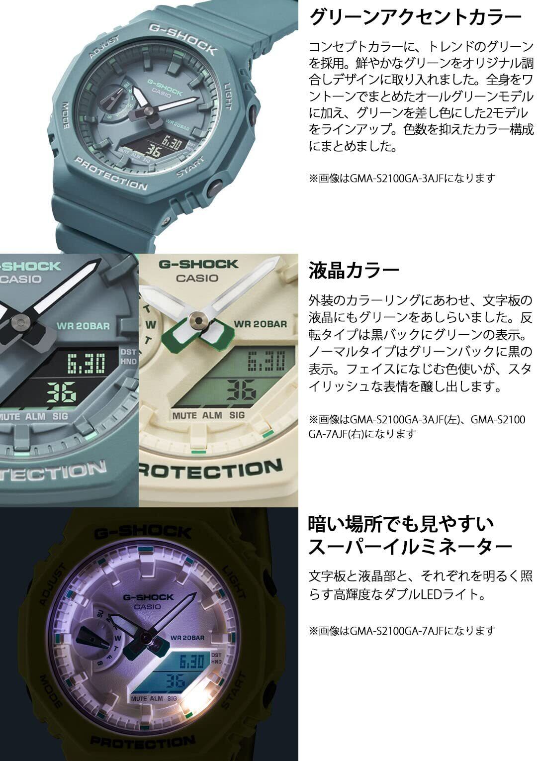 1983年の発売以来、飽くなき強さを求めて進化を続けるタフネスウオッチG-SHOCKから、人気のデジタル・アナログコンビモデル、GMA-S2100シリーズから、グリーンをアクセントカラーに採用したモデルです。フラットな文字板とシンプルなバーインデックスがミニマルな印象を演出。ロゴやインデックス、液晶などにトレンドのグリーンを取り入れており、ストリートファッションとも相性が良いカジュアルでスタイリングしやすいシリーズです。