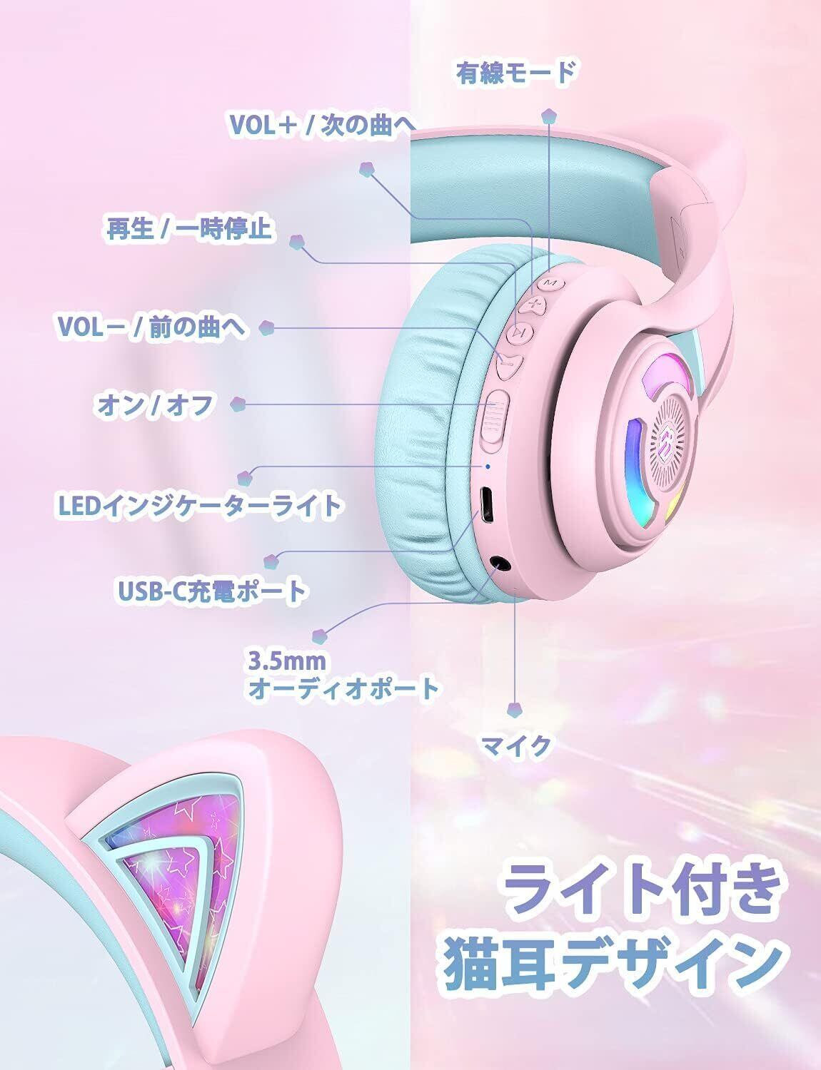 iClever 子供用ヘッドホン Bluetoothヘッドフォン 猫耳LEDライトアップワイヤレスキッズヘッドフォン 音量制限付き(74/85 dBA) 45Hプレイタイム マイク付き 学校/タブレット/PC用 BTH13 ピンク