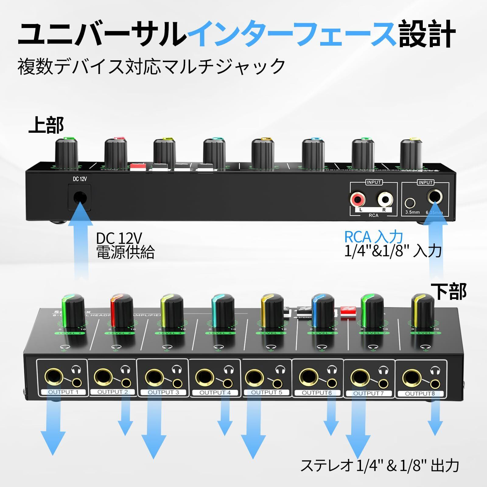 8チャンネルヘッドホンアンプ 3.5mm/6.35mm/RCAジャック、8つのヘッドホン出力ポートを備えた金属製ヘッドフォンスプリッター、ステレオスイッチ付きコンパクトヘッドホンアンプ、RGBライト。