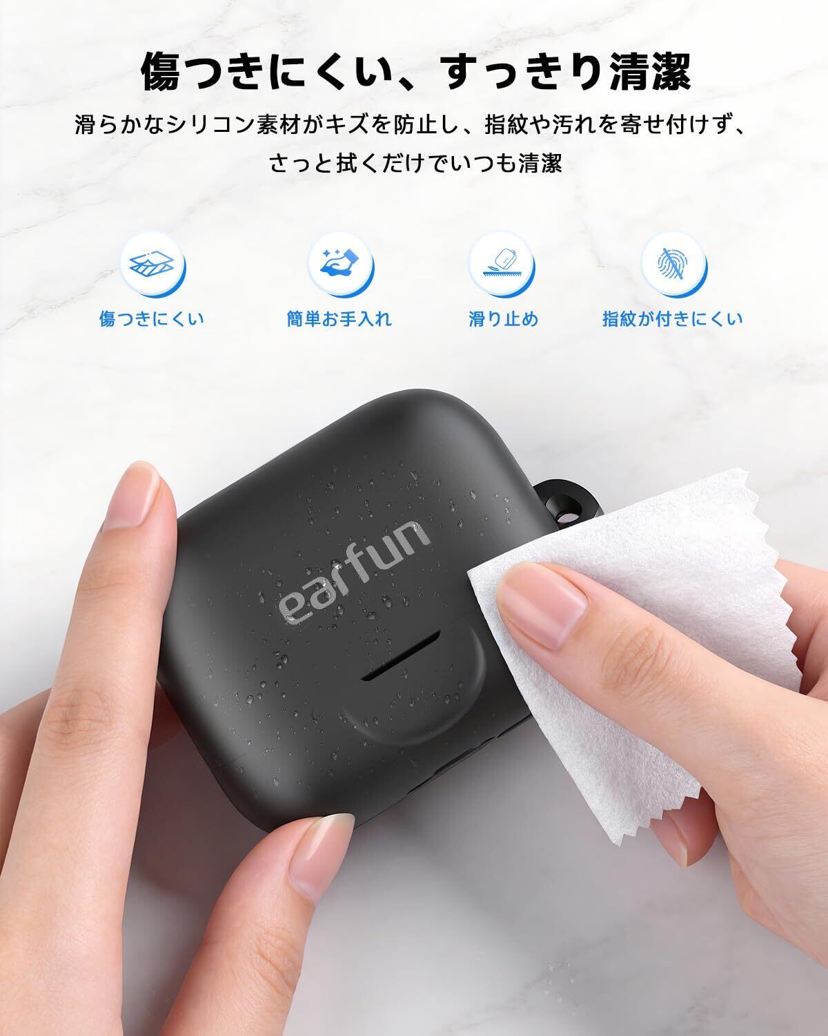 【柔らかいシリコン保護カバー】高品質シリコン素材を使用し、シルクのような滑らかな手触りと優れた保護機能を兼ね備えています。スクラッチ、汚れ、水、ほこりからしっかり守ります。衝撃時には柔らかいシリコンがクッションのように働き、イヤホンの落下をしっかりガード。