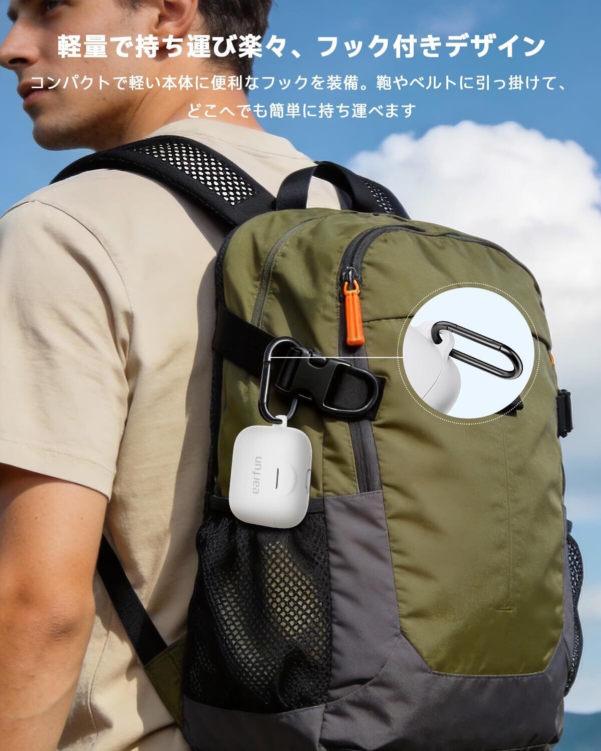 【持ち運びに便利】コンパクトで軽量な本体に、便利な金属カラビナを装備。鞄やベルトに引っ掛けて、どこへでも簡単にお持ちいただけます。旅行、出張、長時間の自転車移動中にも、音楽をお楽しみください。