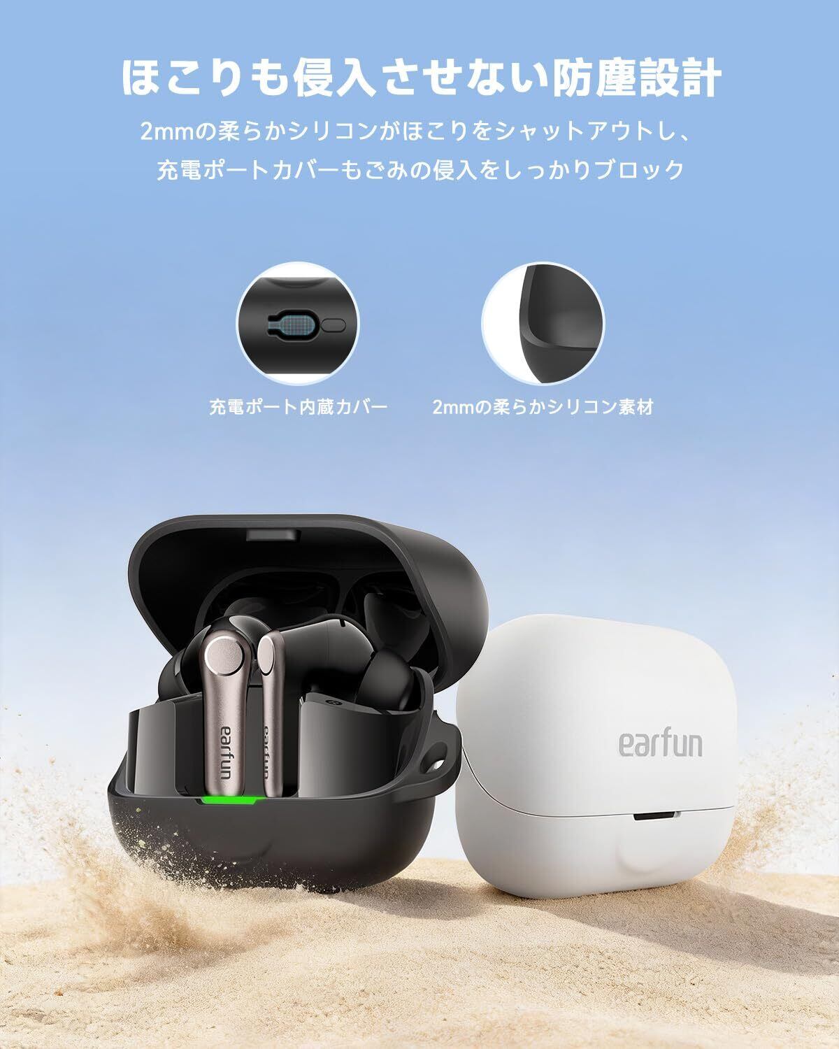 【防塵設計】2mmの柔らかいシリコンがほこりの侵入をシャットアウト。充電ポートカバーもごみの侵入をブロックします。充電口には専用のくり抜きデザインを採用しており、保護カバーを外さずにいつでも充電可能。イヤホンのすべての機能を通常通りお使いいただけます。