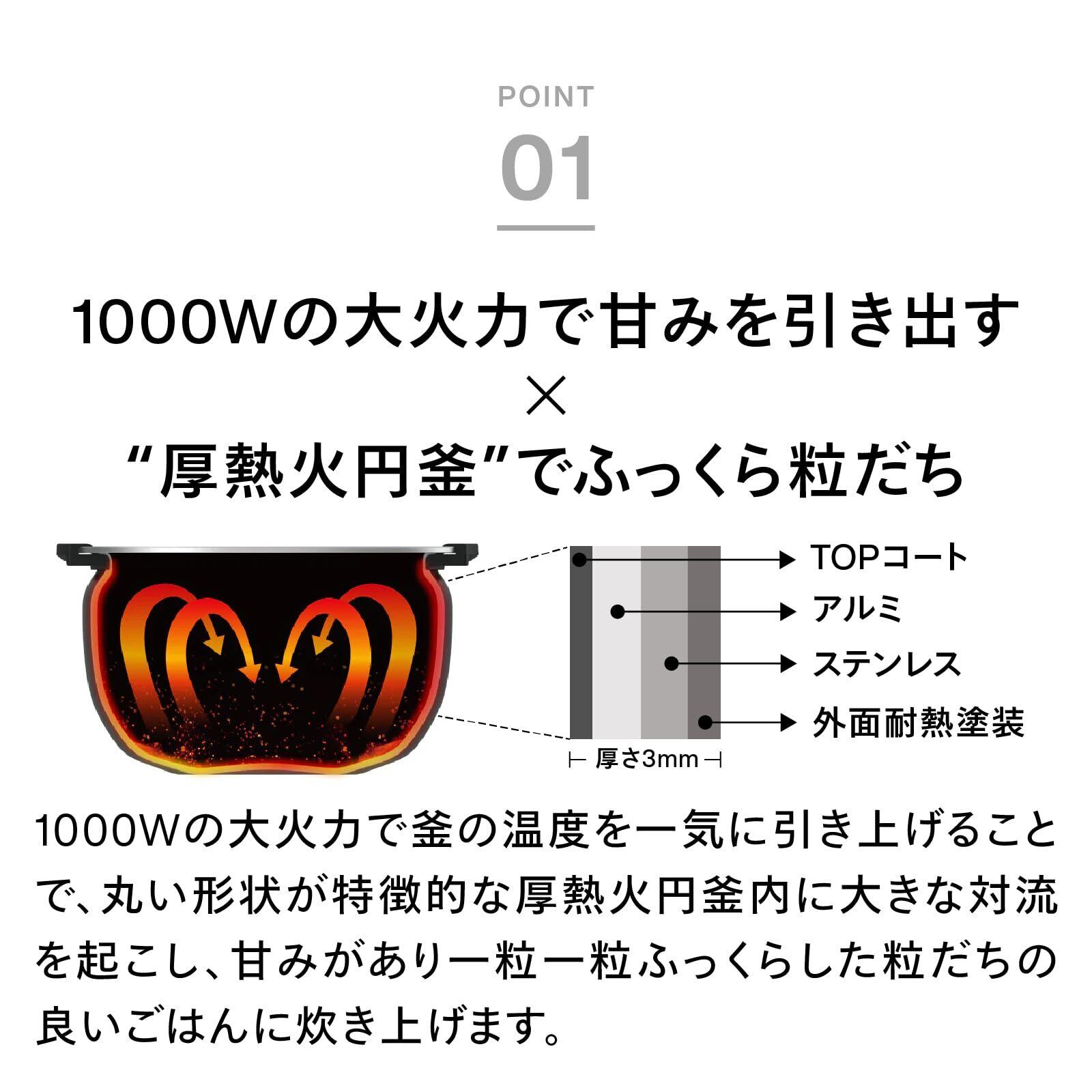 【3mm厚丸釜×大火力IH1000Wではやく、おいしく。】かまどのような丸底と、上部がすぼまった独特な形状が特徴の「厚熱火円釜」を採用。 1000Wの大火力で釜の温度を一気に高温まで引き上げ、大きな熱対流を起こします。お米の芯まで熱を伝え、一粒一粒ふっくらした粒たちのよいごはんに炊き上げます。釜そのものを発熱させて全体に熱を伝えるIHヒーターを使用しているため、マイコンに比べてムラを抑えておいしく炊き上がります。