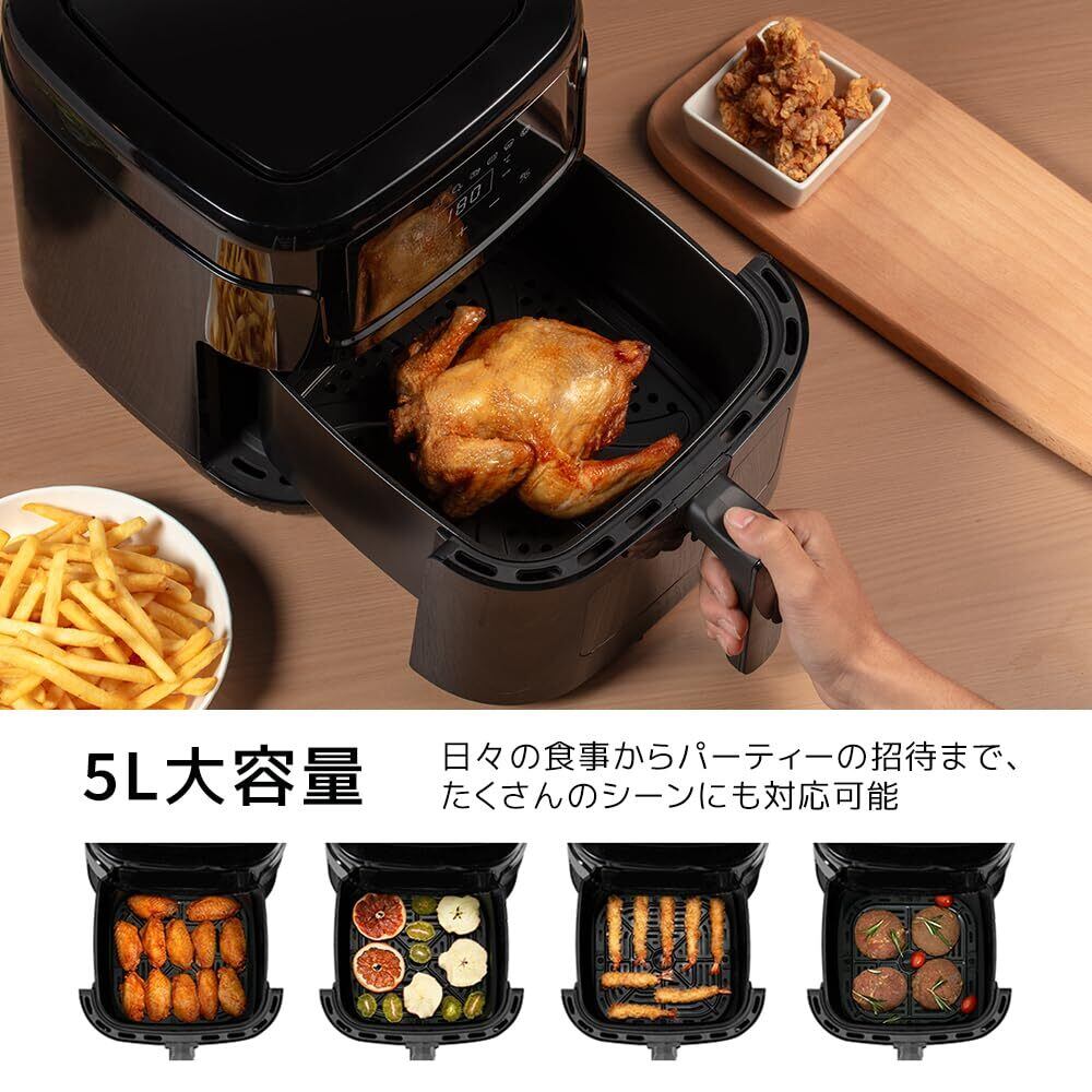 ノンフライヤー 5L 可視窓 大容量 エアフライヤー オイルカット 省エネ 最高温220℃ 1~5人 家庭用 卓上 電気フライヤー ノンオイルフライヤー 揚げ物 惣菜 LEDタッチパネル タイマー 温度調整 日本語説明書 PSE認証済み 12ヶ月 ブラック