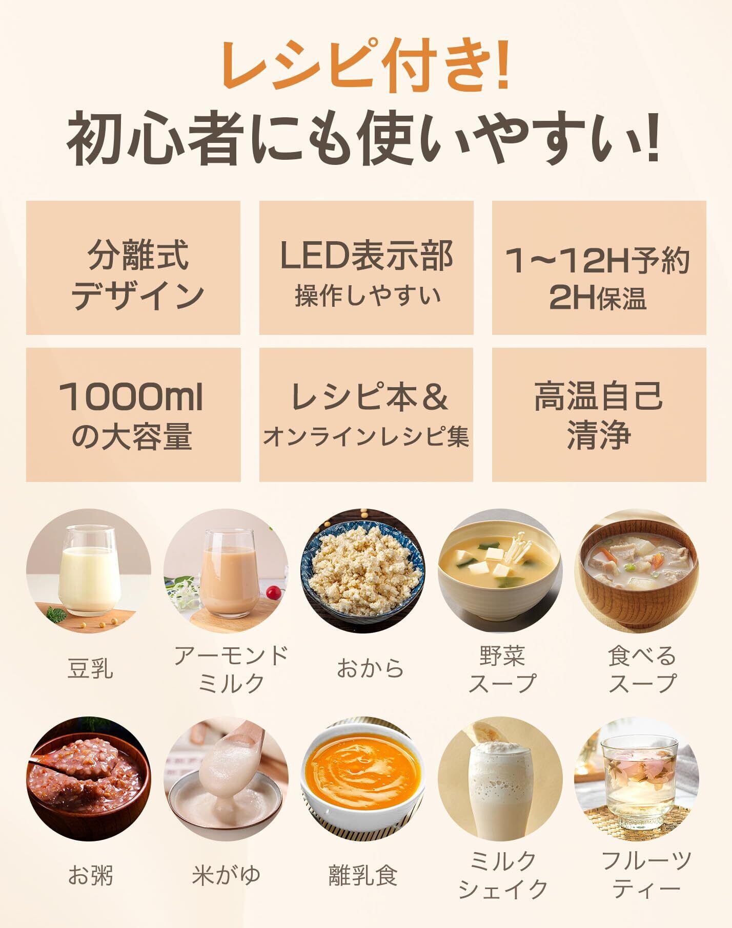 【12H予約&2H保温機能】最大12時間の予約調理が可能な豆乳機。寝る前に材料をセットしておけば、朝には作りたてのあたたかい豆乳が待っています。2時間保温機能付きで、スープポットやポタージュメーカーとしても大活躍。忙しい毎日を支える「置くだけ調理」がこの完全豆乳メーカーの魅力です。