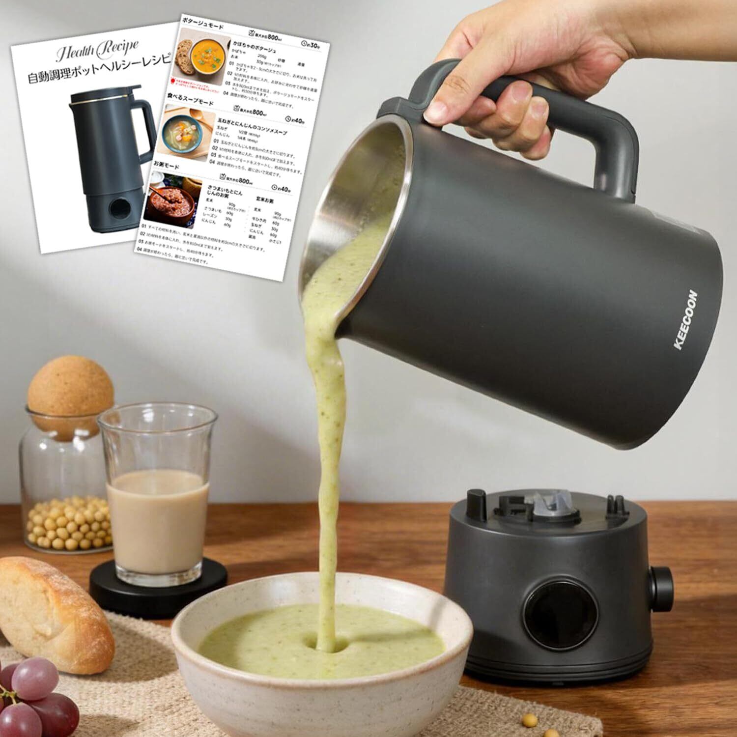 KEECOON スープメーカー 豆乳メーカー ミキサー 加熱式 自動調理ポット大容量 1000ml 完全豆乳 スープポット ブレンダー 豆乳機 豆乳マシーン 多機能14つのモード 保温12H 予約 濾過不要 全自動 分離式構造 お手入れ簡単 高温洗浄 レシピ本付き ポタージュ/豆乳/おかゆ/おから/スープ/お茶 黒