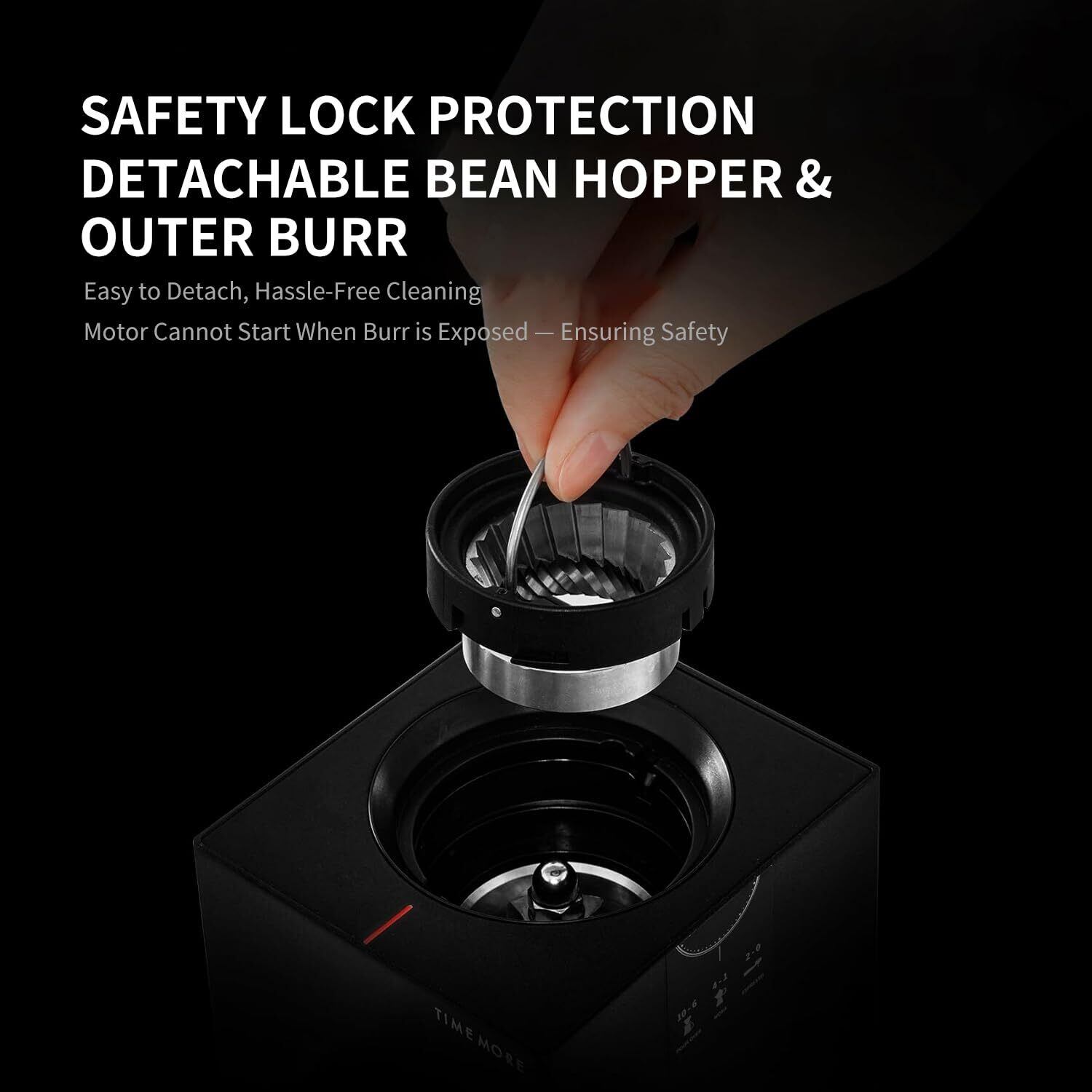 【安全設計のクリーニング機能】本製品は独自の安全ロック機構を採用。クリーニング時に外刃盤を引き上げると、内刃盤が露出した瞬間にモーターが即時ロックされ、誤作動のリスクを完全に回避。安心して手入れができ、便利で安全なコーヒー粉引きをお楽しみいただけます。