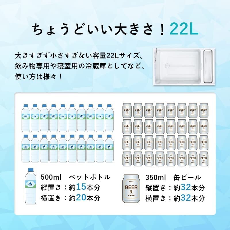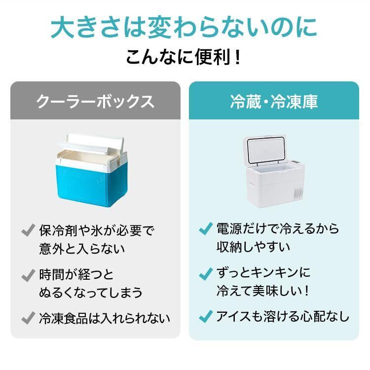 【使用シーン】 キャンプ / レジャー / アウトドア / スポーツ観戦 / 車中泊 / 一人暮らし / サブ冷蔵庫 / セカンド冷蔵庫 / ポータブル冷蔵庫 / 屋外 / 屋内 / 車載用 【製品仕様】サイズ(外寸):598(幅)×320(奥行)×335(高さ)mm、庫内容量:22L、本体重量:約10kg、温度設定範囲:-20℃~20℃、対応電源:AC100V、DC12/24V、定格消費電力:70W、電源ケーブル:AC電源コード/1.4m ACアダプタコード/0.46m (AC電源+アダプタ=2.0m) DC電源コード/3.5m、冷却方法:コンプレッサー式、断熱材:ウレタン