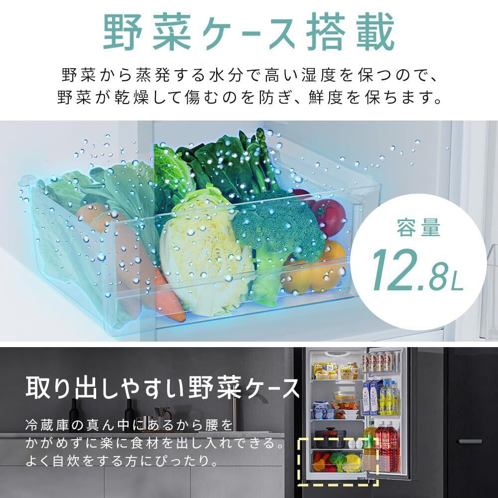 野菜室【12.8L】搭載!自炊生活に欠かせない野菜。湿度が高く設定されているので、野菜が乾燥して傷むのを防ぎ、鮮度を保ちます。野菜室は冷蔵庫の真ん中に。腰をかがめずに食材を出し入れできるので、自炊をする方にぴったり。